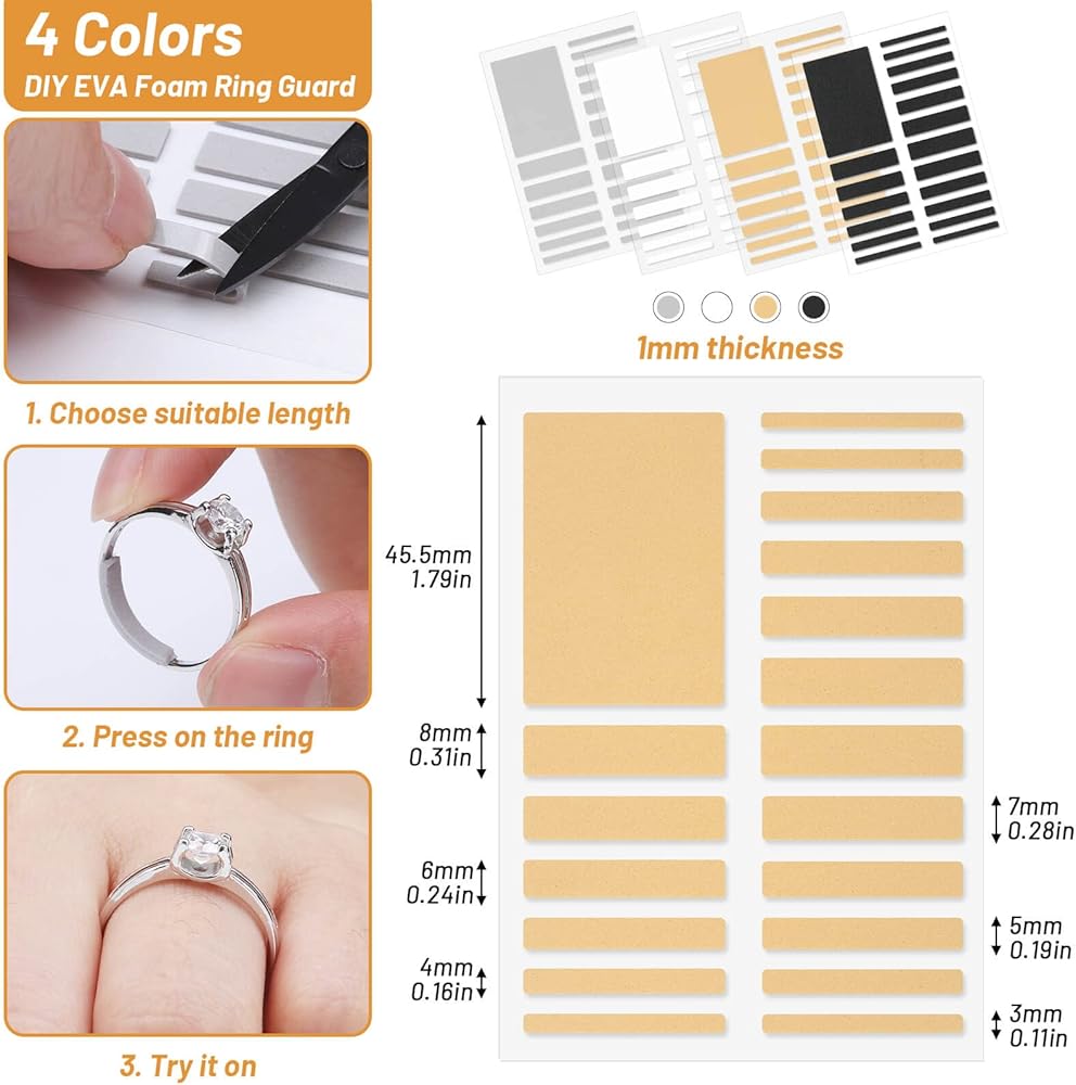 【واقي حلقي فريد من نوعه من إسفنج ايفا جيد التهوية】4 أوراق من أدوات ضبط مقاس الخاتم و76 قطعة إجمالاً، 19 قطعة من الأشرطة اللاصقة لكل ورقة. اللون الأسود والأبيض والرمادي والأصفر لتختار من بينها. اقطعها واضغط عليها برفق بإصبعك لتثبيتها بشكل أفضل بالخاتم. مادة فوم ايفا جيدة التهوية تجعلها ناعمة ومريحة للغاية!