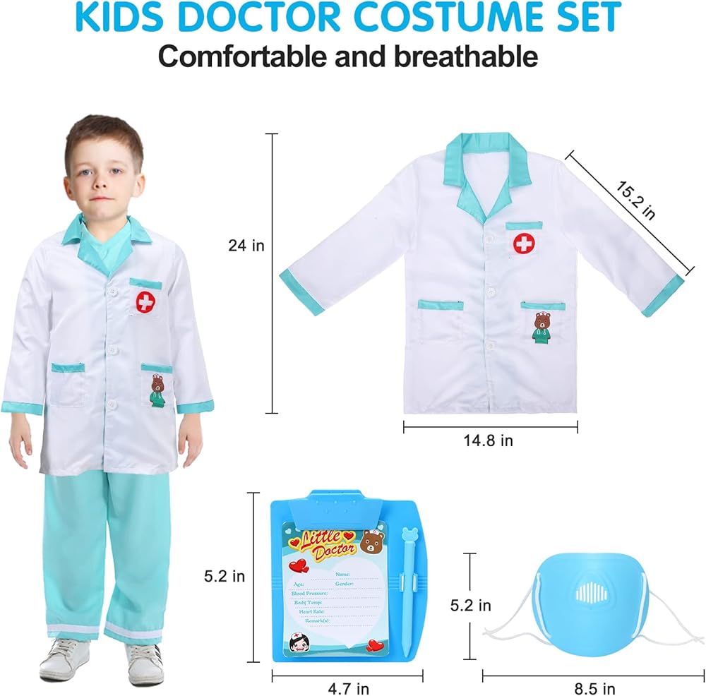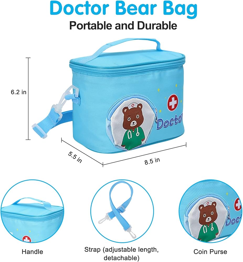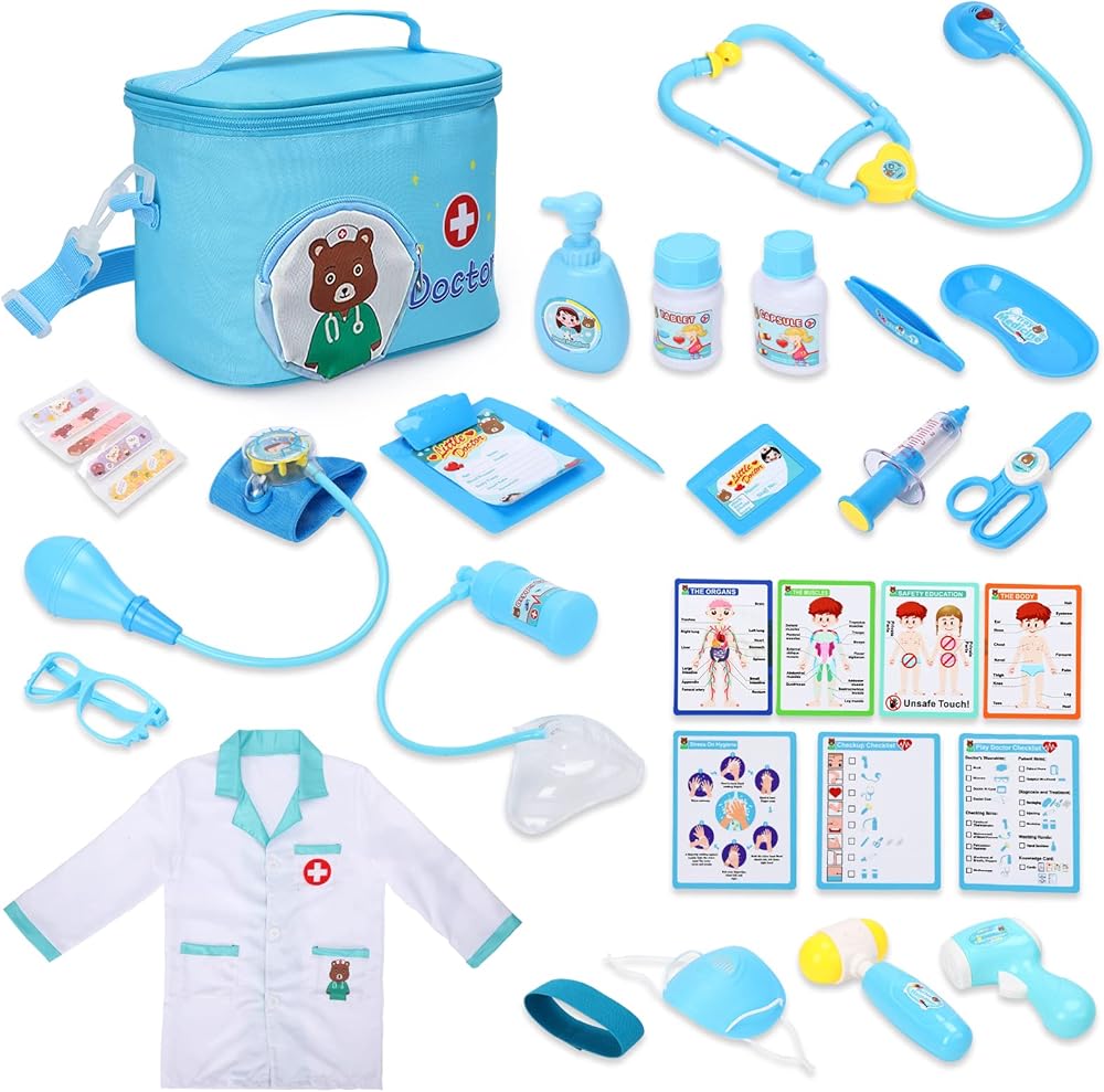 مجموعة الطبيب للأطفال: مجموعة طبيب لعب مكونة من 31 قطعة للأطفال مع سماعة الطبيب، وأساور ضغط الدم، ومقياس الحرارة، وأسطوانة الأكسجين، والمحاقن، والضمادات، وغيرها من أساسيات الإسعافات الأولية للتشخيص والعلاج، وبطاقات التعلم، وزي الطبيب للأطفال وحقيبة الحمل. .