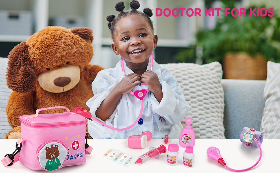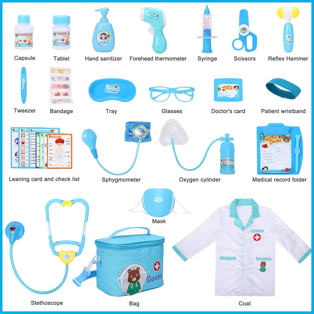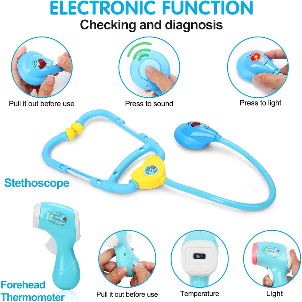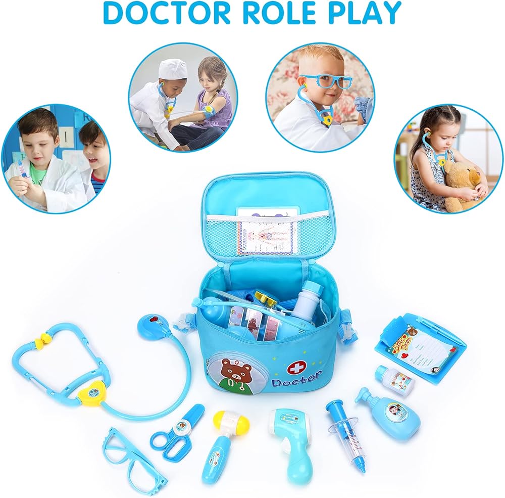 مجموعة الطبيب للأطفال: مجموعة طبيب لعب مكونة من 31 قطعة للأطفال مع سماعة الطبيب، وأساور ضغط الدم، ومقياس الحرارة، وأسطوانة الأكسجين، والمحاقن، والضمادات، وغيرها من أساسيات الإسعافات الأولية للتشخيص والعلاج، وبطاقات التعلم، وزي الطبيب للأطفال وحقيبة الحمل. .