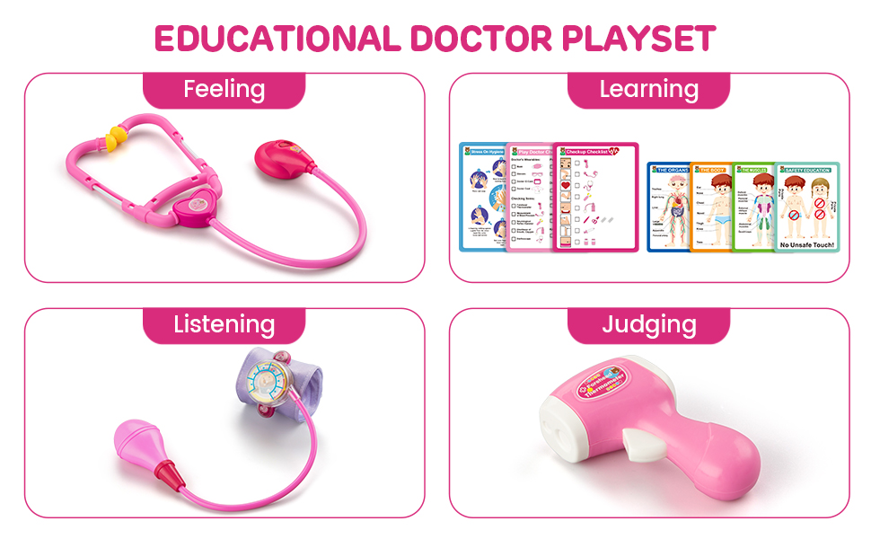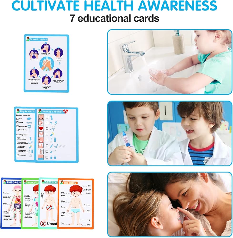 التعلم والتعليم: تتضمن مجموعة طبيب الأطفال هذه 5 بطاقات تعليمية لتعليم السلامة، والوعي بالنظافة، وإدراك الجسم، وقائمة مرجعية للتشخيص والعلاج. نحن نشجع التفاعل بين الوالدين والطفل، فالآباء هم دائمًا معلمو التنوير لأطفالهم.