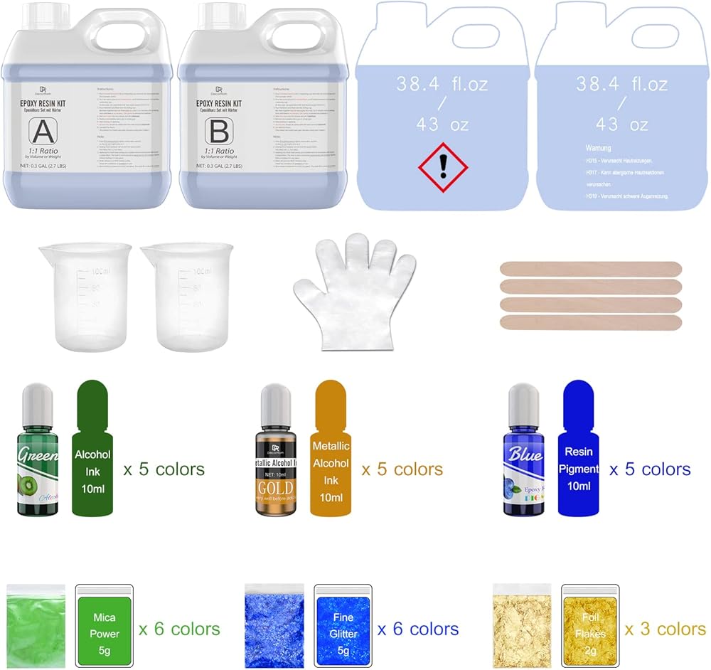 الكل في واحد - تشتمل مجموعة إكسسوارات الراتنج المثالية على 128 أونصة سائلة بنسبة خلط 1:1 من راتنجات الإيبوكسي، وأحبار الكحول × 5، وأحبار الكحول المعدنية × 5، وصبغة الراتنج السائل × 5، ومسحوق الميكا × 6، ورقائق الرقائق المعدنية × 3، جليتر ناعم × 6، أكواب خلط من السيليكون × 2، قفازات، أعواد.