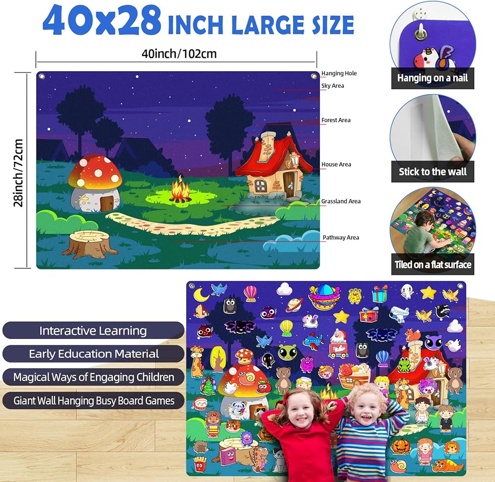 【صديقة للبشرة وخالية من الرائحة】لوحة الأنشطة التعليمية لمرحلة ما قبل المدرسة هذه مصنوعة من لوح لباد فلانيل عالي الجودة وخالي من الرائحة. يمكن لصق السطح بقوة وليس من السهل أن يسقط. نقاط فيلكرو ذاتية اللصق، سهلة الاستخدام للأطفال ولصقها في أي مكان. 4 خطافات متينة مرفقة، يمكن تعليق لوحة الخلفية الكبيرة بسهولة.