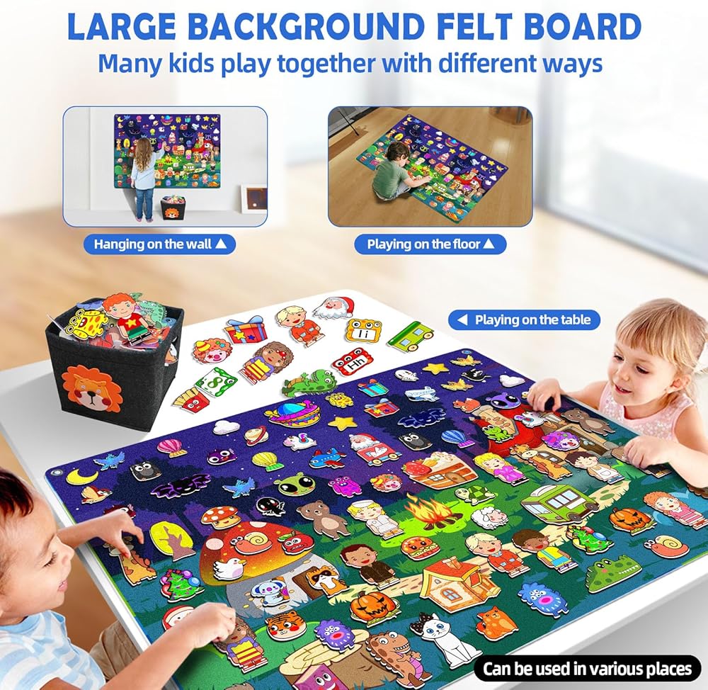 【مسلية وتعليمية】مجموعة قصص لوح اللباد الخاصة بنا هي مجموعة تعليمية مبكرة رائعة للأطفال. اللعب بالألعاب هو طريقة آمنة وإيجابية للأطفال لتعلم كيفية التعامل مع مشاعرهم، والابتعاد عن الشاشة والاستمتاع بوقت ممتع. التعلم الحسي من الألوان والحيوانات والأشجار وغيرها مع التركيز. وهي مصممة لتحفيز أدمغة الأطفال، وتحسين اللعب المستقل أو التعاوني، والتنسيق بين اليد والعين، وتطوير الخيال.