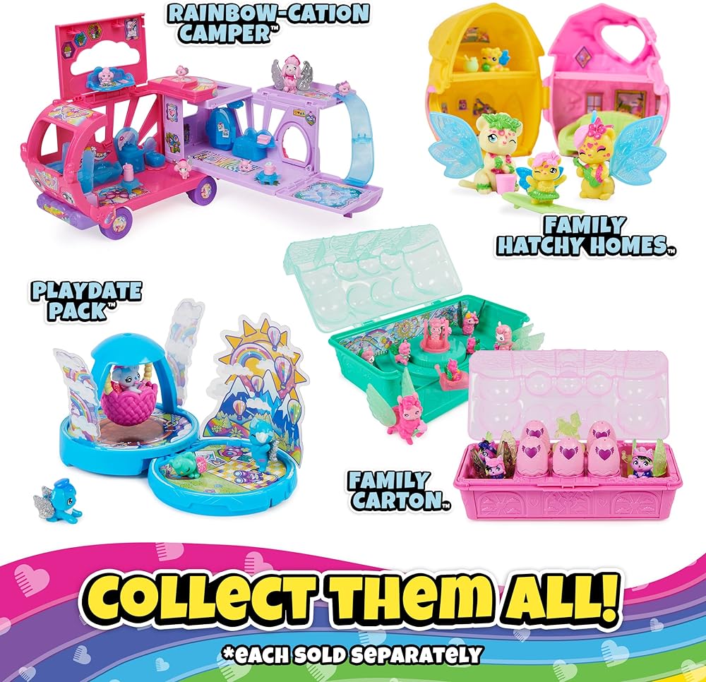 افقس 3 بيضات: اعثر على الأم و3 بيضات مفاجئة وملصقات لتزيين الجزء الداخلي من العربة في الصندوق! اكسر كل بيضة من بيضة هاتشيمالز لتكشف عن الأطفال الأربعة وفتح الباب مفتوحًا لمقابلة الطفل الصغير!