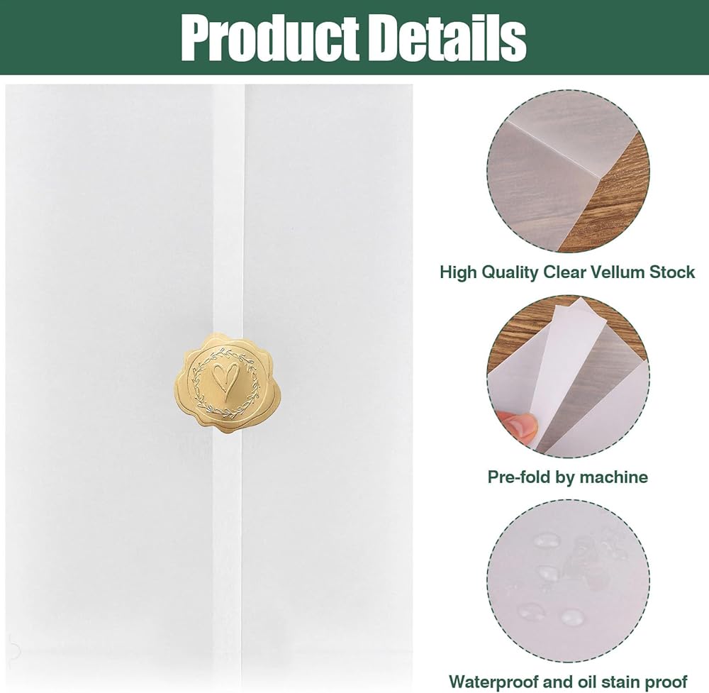 【سترات فيلوم مطوية مسبقًا】يمكن أن تضيف سترات الفيلوم الخاصة بنا للدعوات 5x7 لمسة غير لامعة إلى البطاقات، وسهلة الاقتران مع أنواع متعددة من الدعوات والبطاقات، وتصميم قابل للطي مسبقًا على السترات والتصميم ذاتي اللصق على أختام الشمع يمكن أن يوفر وقتك. .