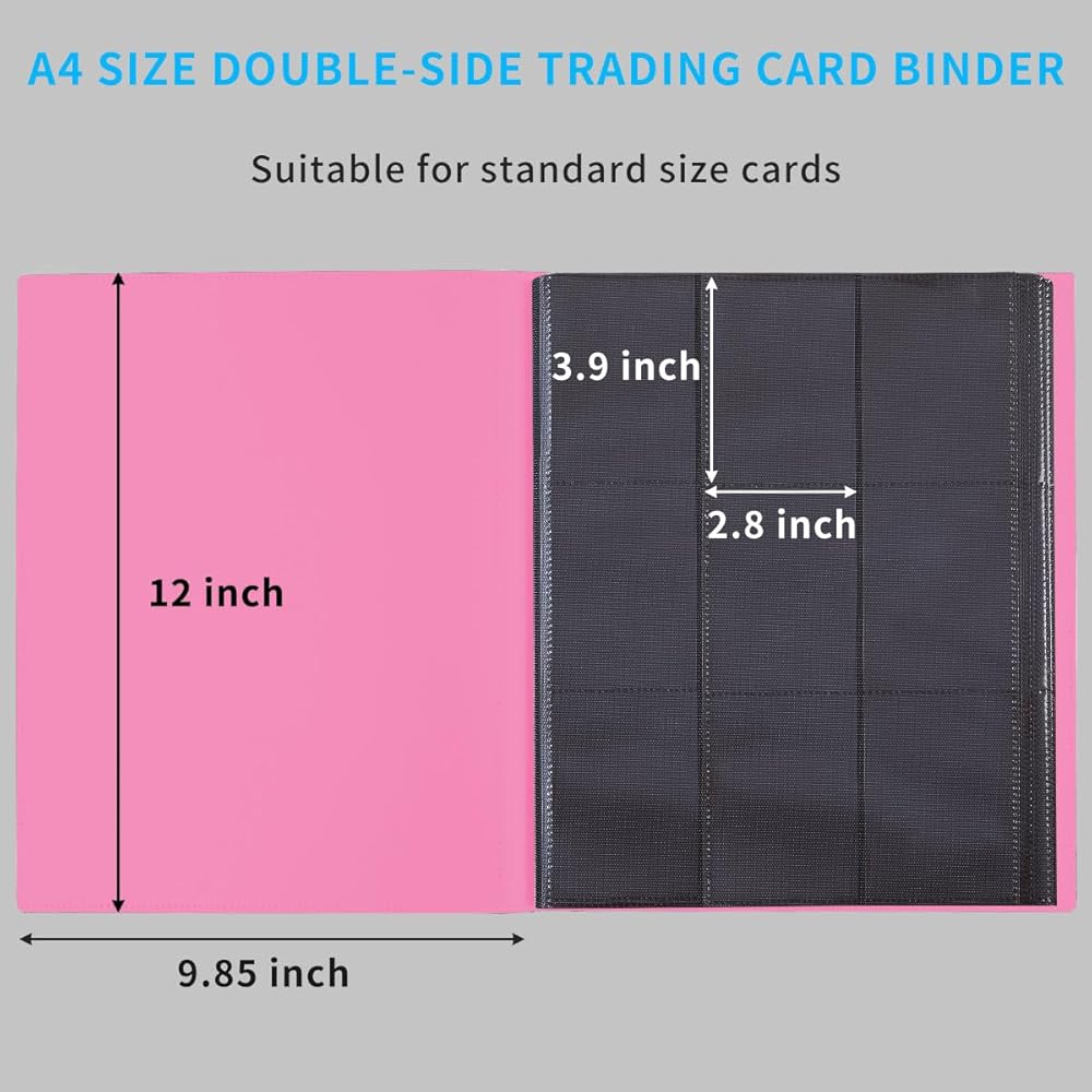 • ❤️【تصميم مزدوج الجانب وكبير الحجم】- 18 جيبًا لكل ورقة (9 جيوب في كل صفحة)، 24 ورقة إجمالي 432 جيبًا تعطي المزيد من الجيوب لتنظيم وتخزين بطاقتك لحامل بطاقات بوكيمون واحد. جيوب كبيرة الحجم مقاس 2.7 × 3.8 بوصة تناسب البطاقة مع مساحة كبيرة للبطاقات ذات الأكمام، بشكل مريح ونقل البطاقات عندما تحتاج إلى إعادة التنظيم