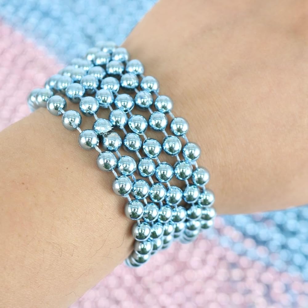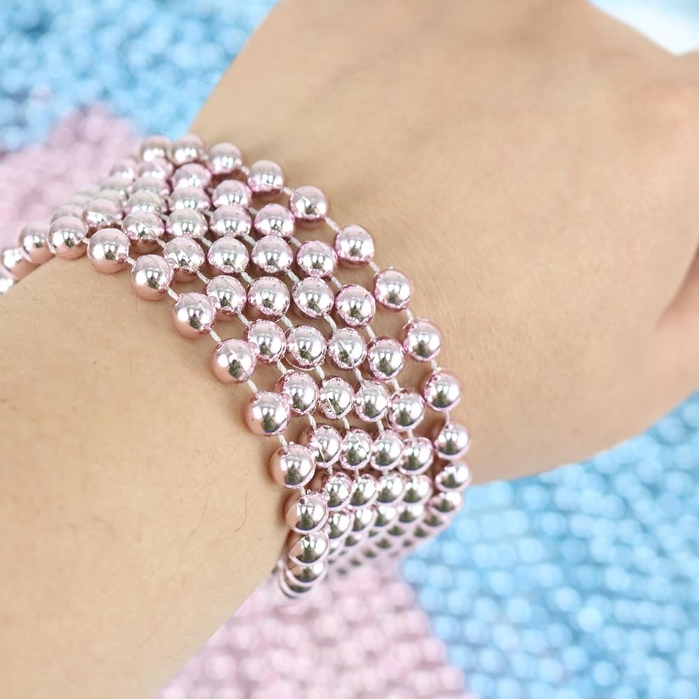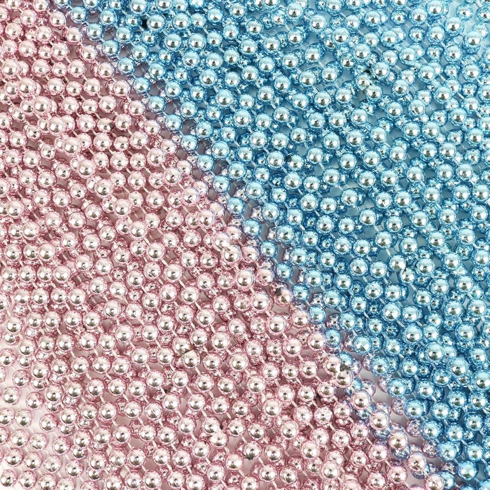 - Includes 72 plastic bead necklace in Metallic light pink and light blue