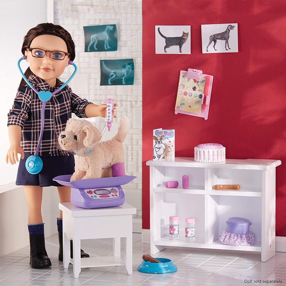 تتضمن مجموعة الحيوانات الأليفة البيطرية قطعة واحدة من اللابرادور الأصفر، ومقياس، ومجموعتين من بطاقات الحيوانات والأشعة السينية، و3 ضمادات، وزجاجتي وصفة طبية، وسماعة طبيب، ومخروط، وعبوة ثلج، وعظمة، وطبق ماء، وحقنة، وكعكة، وبطاقة تمنية صحية، وقلم وملصقات.