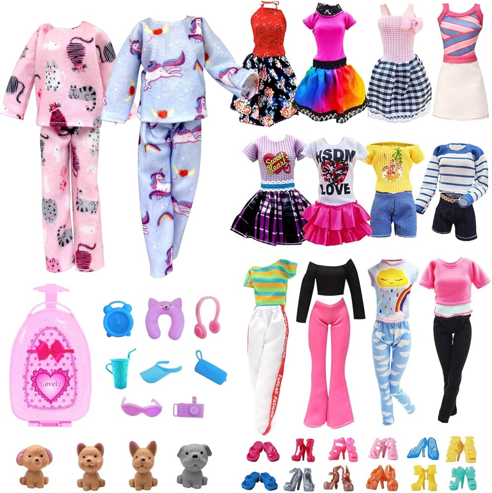 مجموعة متنوعة من إكسسوارات الملابس و6 ملابس وفساتين عصرية للاستخدام النهاري، ومكونة من قطعتين لملابس المنزل الليلية.