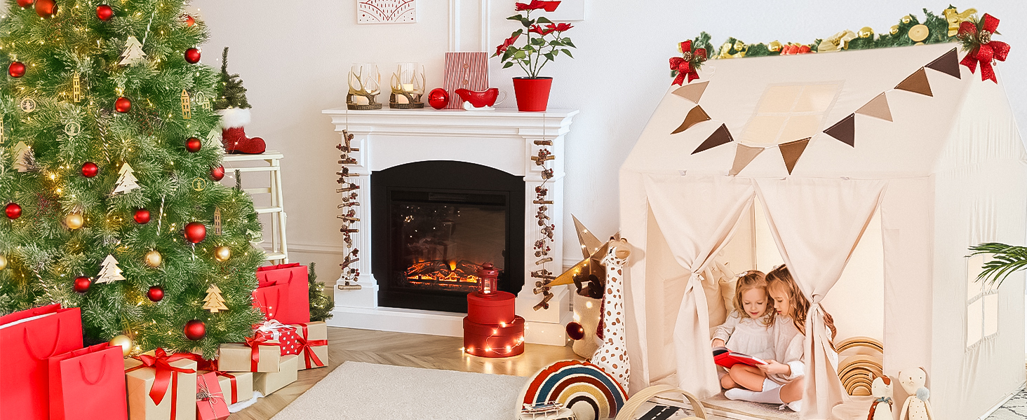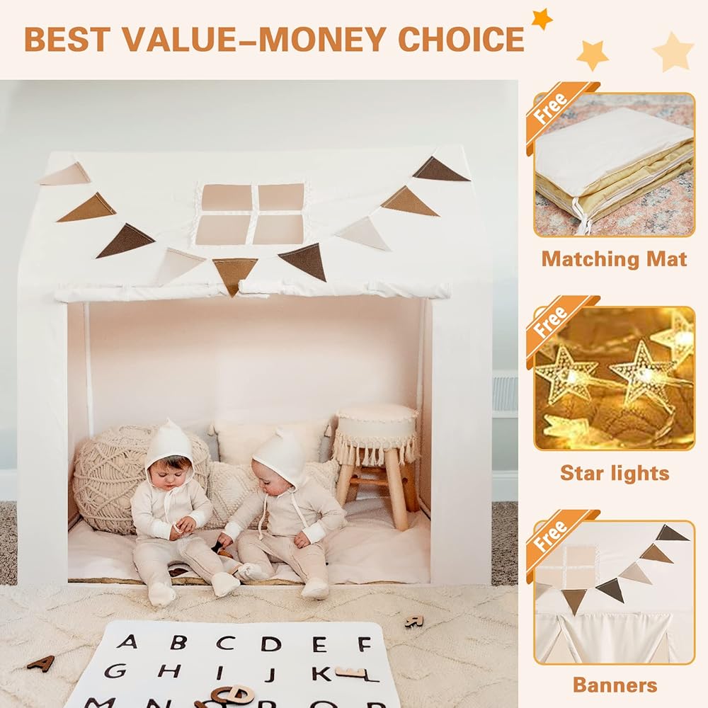 سيناريوهات الاستخدام المتنوعة: خيمة لعب الأطفال لدينا متعددة الاستخدامات. يؤدي إعدادها في الداخل إلى إنشاء منطقة لعب مخصصة لطفلك بينما يساعد في احتواء أي فوضى محتملة أو ألعاب متناثرة. وبدلاً من ذلك، يوفر استخدامه في الهواء الطلق مساحة نوم ممتعة لطفلك وأصدقائه. كمكافأة إضافية، قمنا بتضمين أضواء النجوم والأعلام والحصائر لتسهيل تزيين الخيمة.