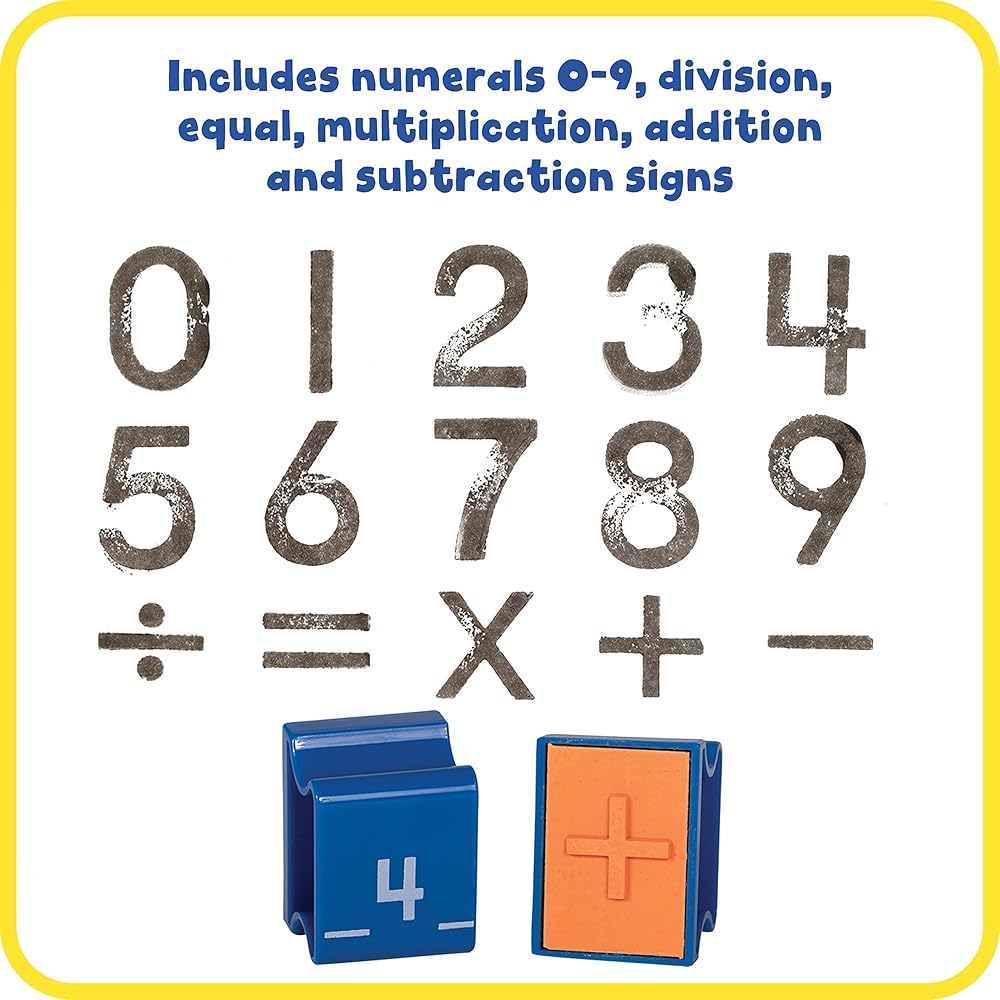يمكن استخدام طوابع الأرقام والعلامات من Ready2Learn في العد والتسلسل وعمل حقائق الرياضيات والمطابقة والملصقات والرسوم البيانية والألعاب. هذه المجموعة المتنوعة المكونة من 15 ختم مطاطي مع مقابض بلاستيكية ستثبت أنها موفرة للوقت. تأتي المجموعة في حقيبة تخزين واضحة ومميزة ومقسم خاصة بها وتتضمن الأرقام 0-9 والعلامات التالية: بالإضافة إلى ذلك، والطرح، والمضاعف، والقسم، والمساويات. باي سينتر انتربرايسز