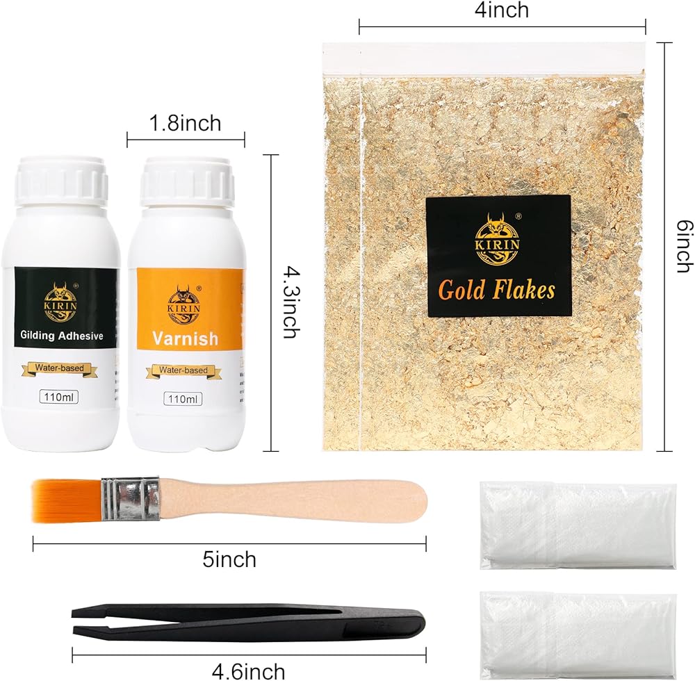 [ GILDING ADHESIVE SET ]: This set contains a bottle of 110ml gold foil glue, a bottle of 110ml water-based varnish, 2 brushes, 2 pair of gloves and 1 gilding brush, easy to apply evenly