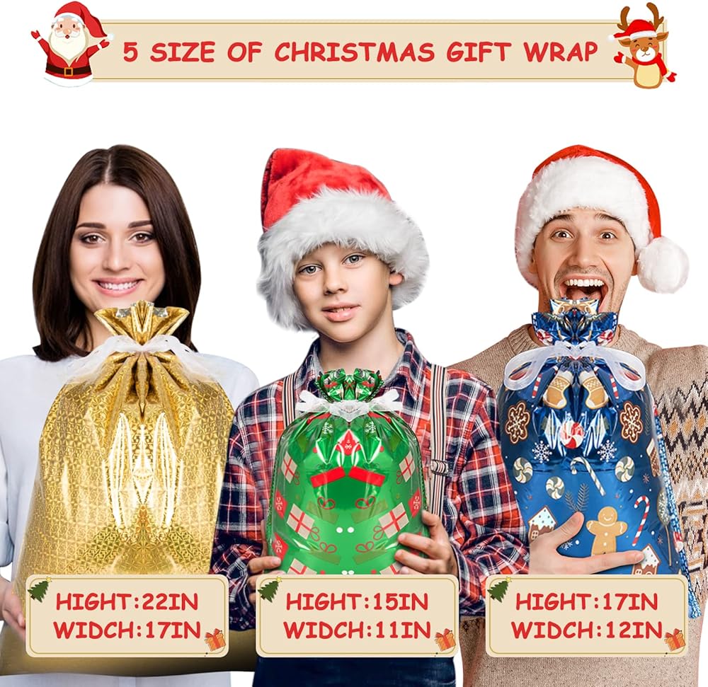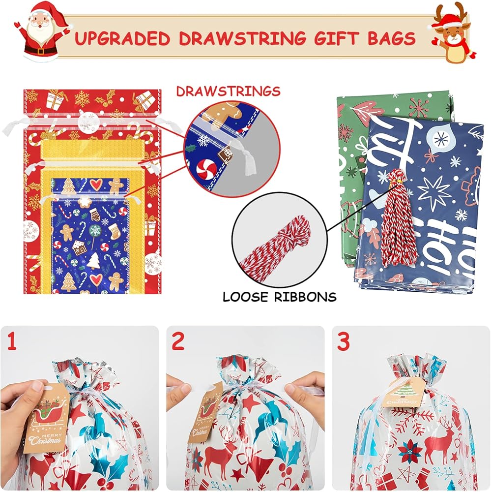 【حقائب هدايا عيد الميلاد بأربطة】لقد قمنا بتحديث الحقائب إلى تصميم إغلاق برباط، وهذا سيساعدك على تغليف هداياك بسرعة وسهولة وتوفير وقت الهدية. فقط عليك إدخال الهدية وسحب ربطة العنق، ثم أنت بعد الانتهاء من التغليف، فإنهم يجعلون تغليف هدايا عيد الميلاد أمرًا سهلاً.