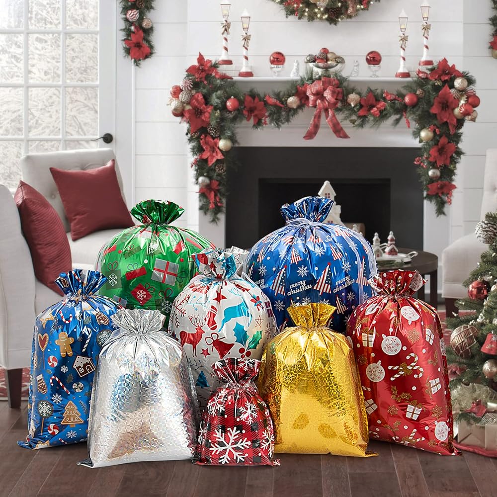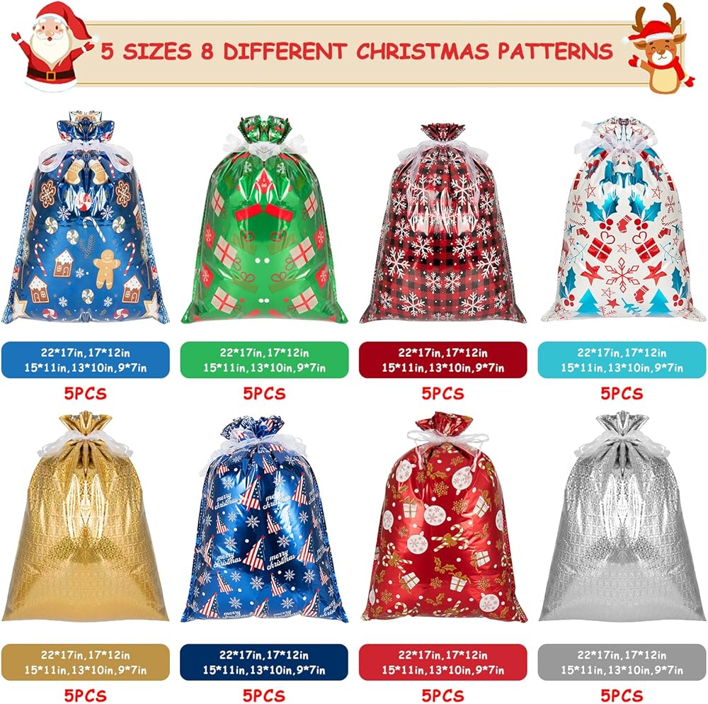 أكياس هدايا عيد الميلاد Lousrnman ، وأكياس هدايا العطلات الكبيرة 40 × ، وعلاقات الورق 50 × Kraft وعلاقات الشريط 2 × 390in ، و 5 × أحجام مختلفة لـ 8 × تصاميم إجمالي 40 حقيبة عيد الميلاد للهدايا.