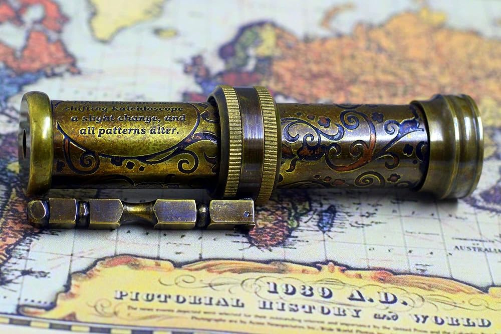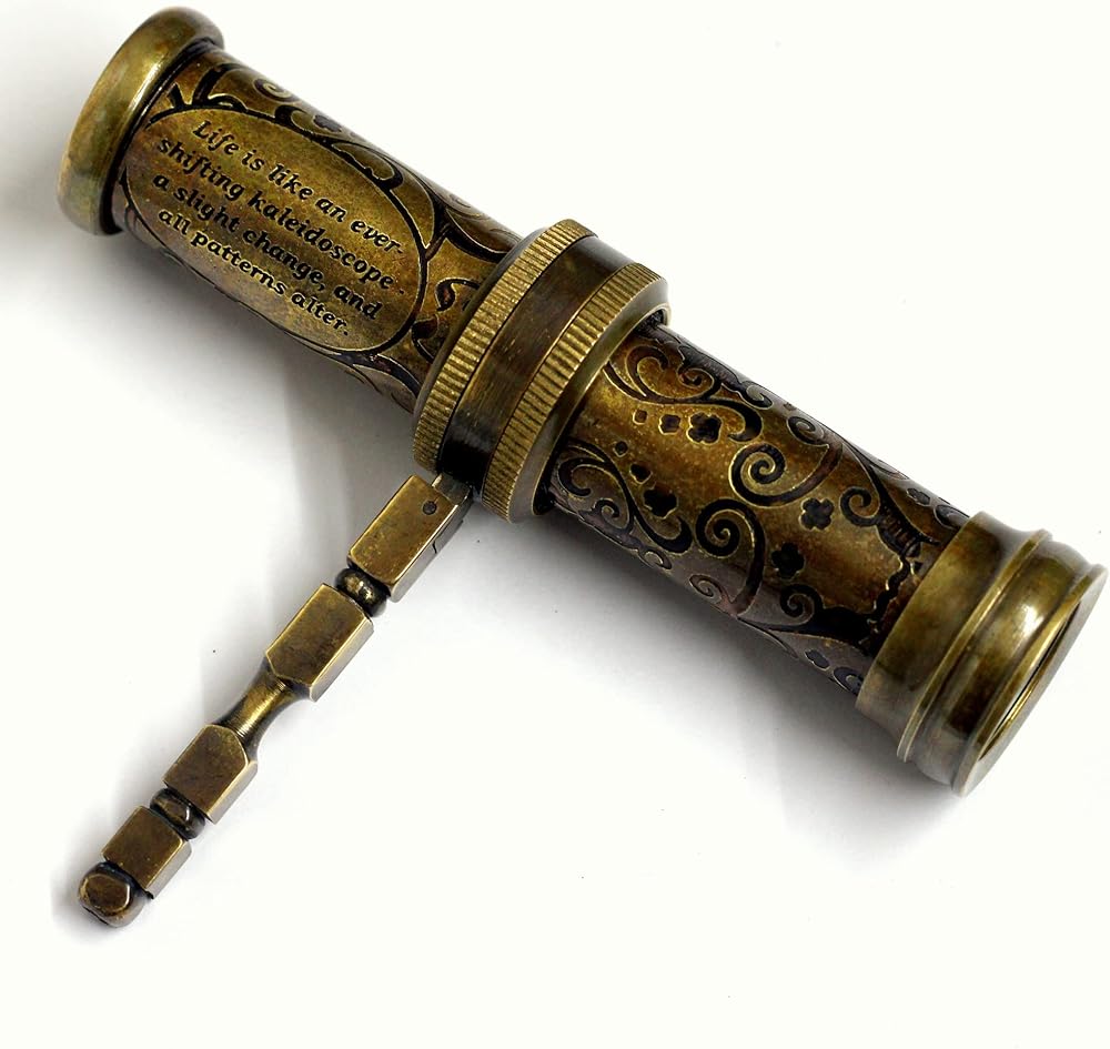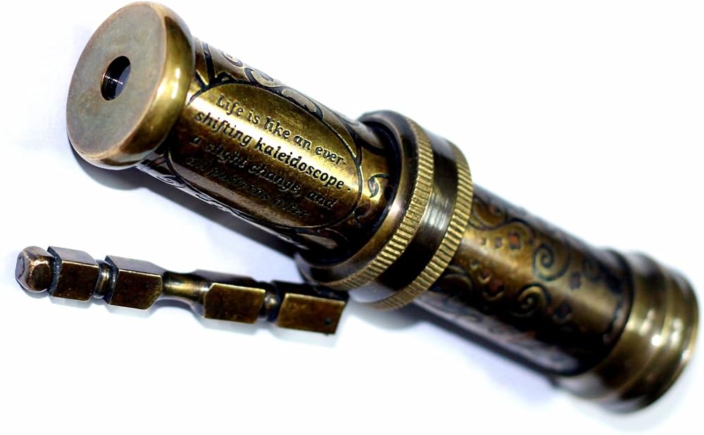 كاليدوسكوبيس، من الكلمة اليونانية "شكل جميل للرؤية"، لقد كانت رائعة للأطفال. منذ اختراعهم في عام 1816 وما زالوا يصنعون العجائب والبهجة في طفل اليوم. مشكال نحاسي بحري عتيق نسخة طبق الأصل هدية مثالية للكريسماس من النحاس العتيق. صُنع في 1816-1817S ويتميز بحالة عتيقة جيدة جدًا، كما ترى في الصور. منتج عتيق قابل للتجميع. يرجى قراءة الوصف والنظر إلى الصور بعناية عجلات دوارة زجاجية. مرآة داخلية تخلق صورًا ملونة. منظار زجاجي ملون مصنوع يدويًا من لحام خالٍ من الرصاص لحمايتك وحماية البيئة. يحمل مبدأ المشكال وجود عدد معين من قطع الزجاج الملون في المشكال. تبقى كمية وجودة هذه القطع في المشكال دون تغيير، ولكن طالما تم تدوير المشكال وتحدث مجموعات جديدة من القطع، سيكون هناك أنماط وأنماط جديدة لا حصر لها. كأداة للمصممين، ينتج المشكال مجموعة من الألوان والأنماط المستخدمة لصنع السجاد والزجاج الملون والمجوهرات والأنماط المعمارية وورق الحائط والمفروشات المنسوجة وأفكار للرسامين. مشكال: يستخدم المشكال مرايا مستوية محاذية جنبًا إلى جنب لإنشاء أنماط ملونة لا تنتهي، أداة تحتوي على قطع فضفاضة من المواد الملونة (مثل الزجاج أو البلاستيك) بين لوحين مسطحين ومرآتين مستويتين بحيث تنعكس التغييرات في موضع قطع المواد في مجموعة متنوعة لا حصر لها من الأنماط.