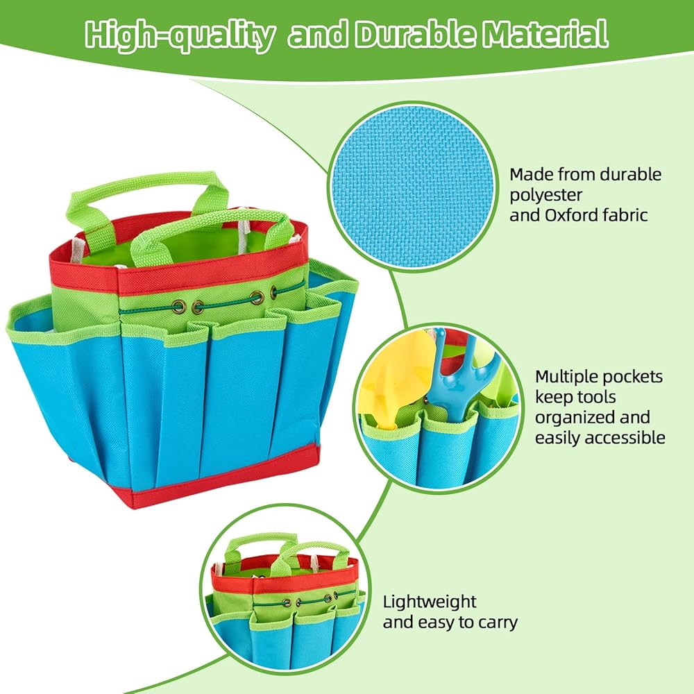 GARDEN TOTE BAG The bag is made of polyester& Oxford which is durable. It featuresseveral pocketswhich will keep all toolsorganizedand in its place. The tote bag islightweightandconvenientfor children to carry with themselves while gardening WATER CAN This metal water can issized smallenough for children to hold it without a hassle. The watering-can measures approximately6"in height and4"in diameter. Made of 100% green recycled plastic, No BPA include RAKE, FORK, SHOVEL These handheld tools feature plastic handles and metal heads. The tools haverounded edgesto ensuresafetyfor the kids. The handles are sized smaller then regular to allow the child sized fingers to have aneasy grip. KID GARDEN GLOVE Bright color and cartoon pattern Small size, make of 100% pure cotton Package including: 1 GARDEN TOTE BAG 1 WATER CAN 1 RAKE 1 FORK 1 SHOVEL 1 KID GARDEN GLOVE.