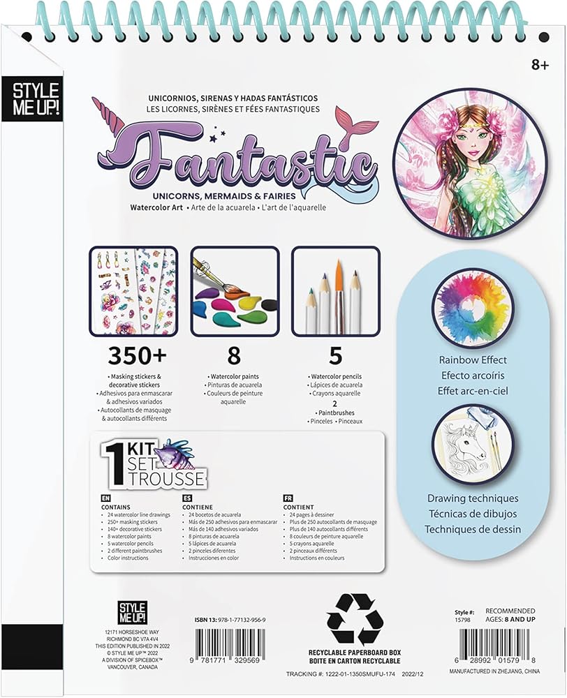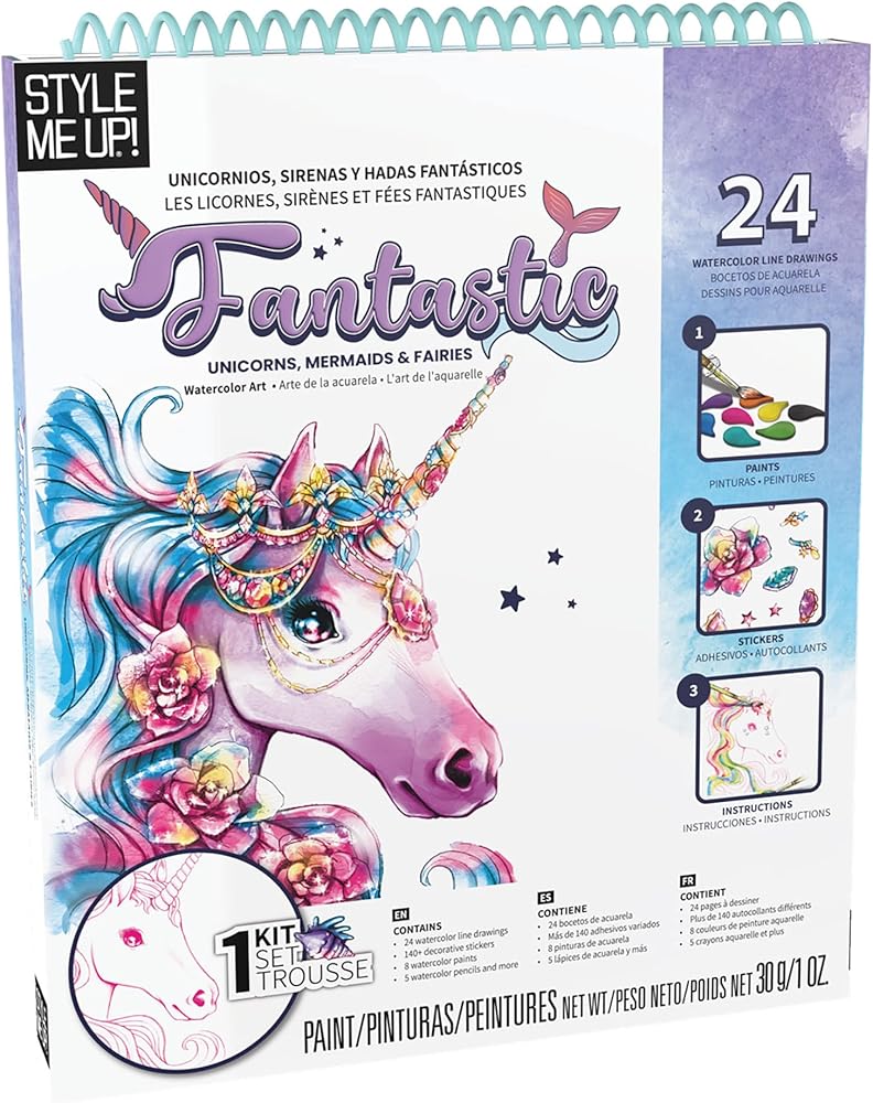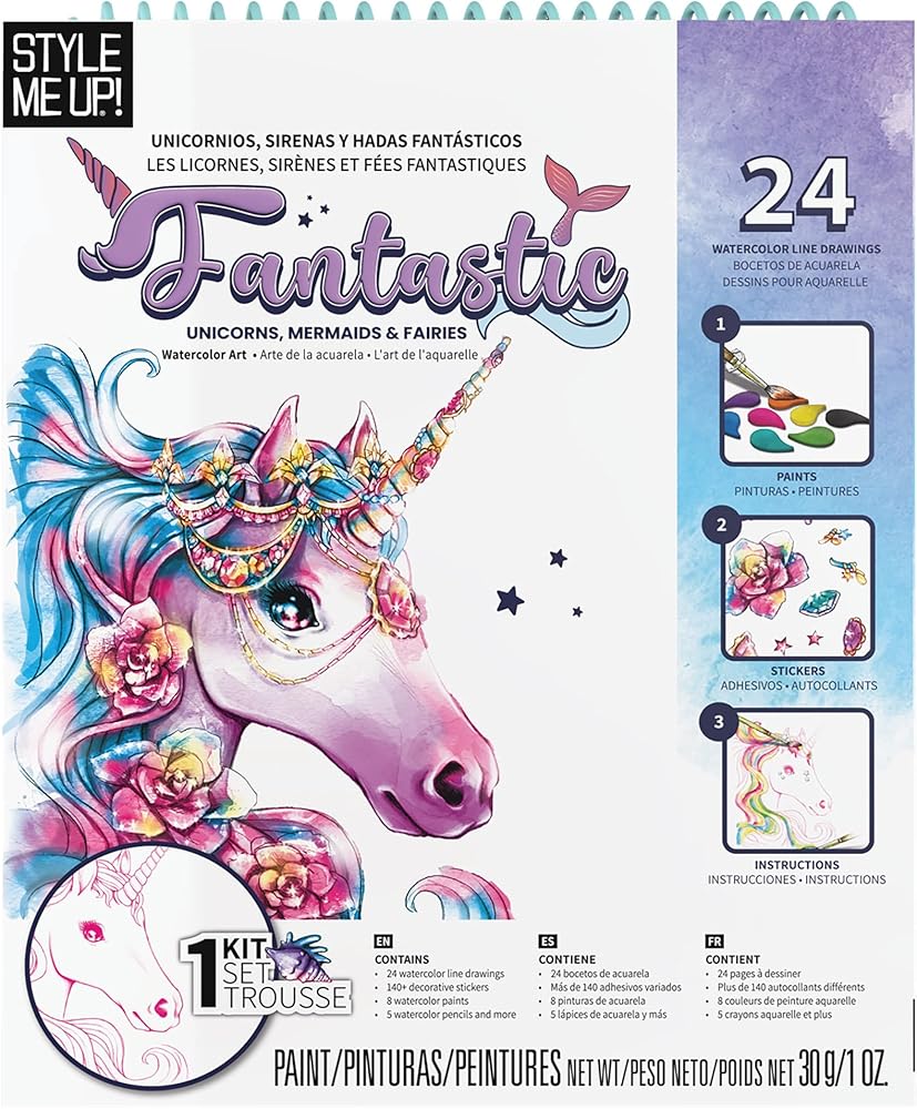 Style Me Up: يونيكورن رائع، حوريات البحر والجنيات، مجموعة طلاء بالألوان المائية، تتضمن 24 قالبًا، وكتيب تفصيلي يعلم الأطفال أساسيات الرسم بالألوان المائية، للأعمار من 8 سنوات فما فوق