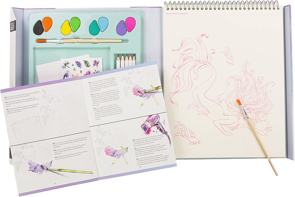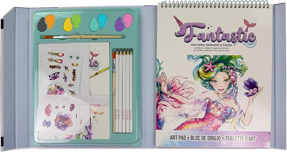• مجموعة فنية بالألوان المائية تسمح للأطفال باستكشاف العالم السحري لوحيد القرن وحوريات البحر والجنيات.