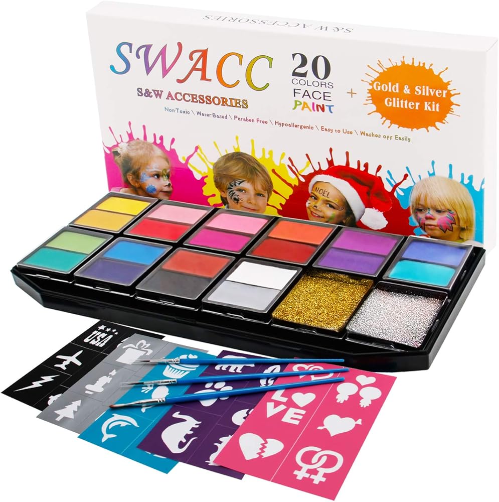 مجموعة طلاء الوجه للأطفال من سواك - 20 لونًا قابلاً للغسل + بريق ذهبي وفضي + 30 ستينسل + 3 فرش - مكياج آمن للوجه والجسم لحفلات الهالوين - غير سام، أساس مائي وسهل الاستخدام