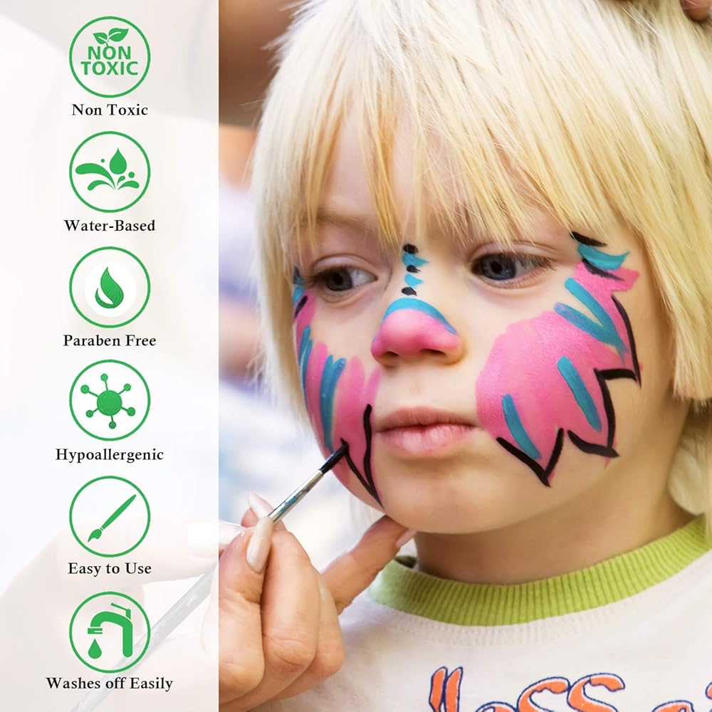 • آمن بنسبة 100%. جميع المكونات غير سامة وذات أساس مائي وخالية من البارابين ولا تسبب الحساسية وطبيعية. مكياج زي احترافي وطلاء آمن للوجه للبشرة الحساسة. كما هو الحال مع أي مستحضرات تجميل، ننصح دائمًا بإجراء اختبار الرقعة أولاً حيث تختلف بشرة الجميع.