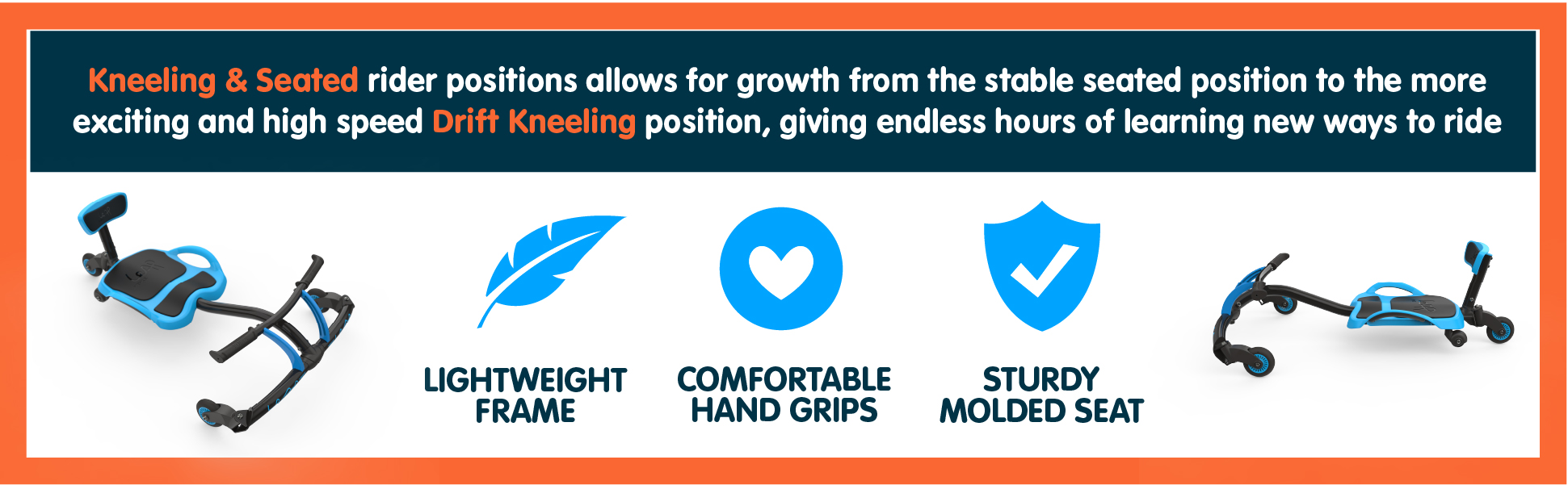 تصميم مريح: تضمن المقابض راحة وأمان الراكب، بينما يوفر المقعد المبطن الناعم ومسند الظهر توسيدًا إضافيًا للرحلات الطويلة ووضعيتين للركوب للركوع والجلوس لمزيد من المرح والتنوع.