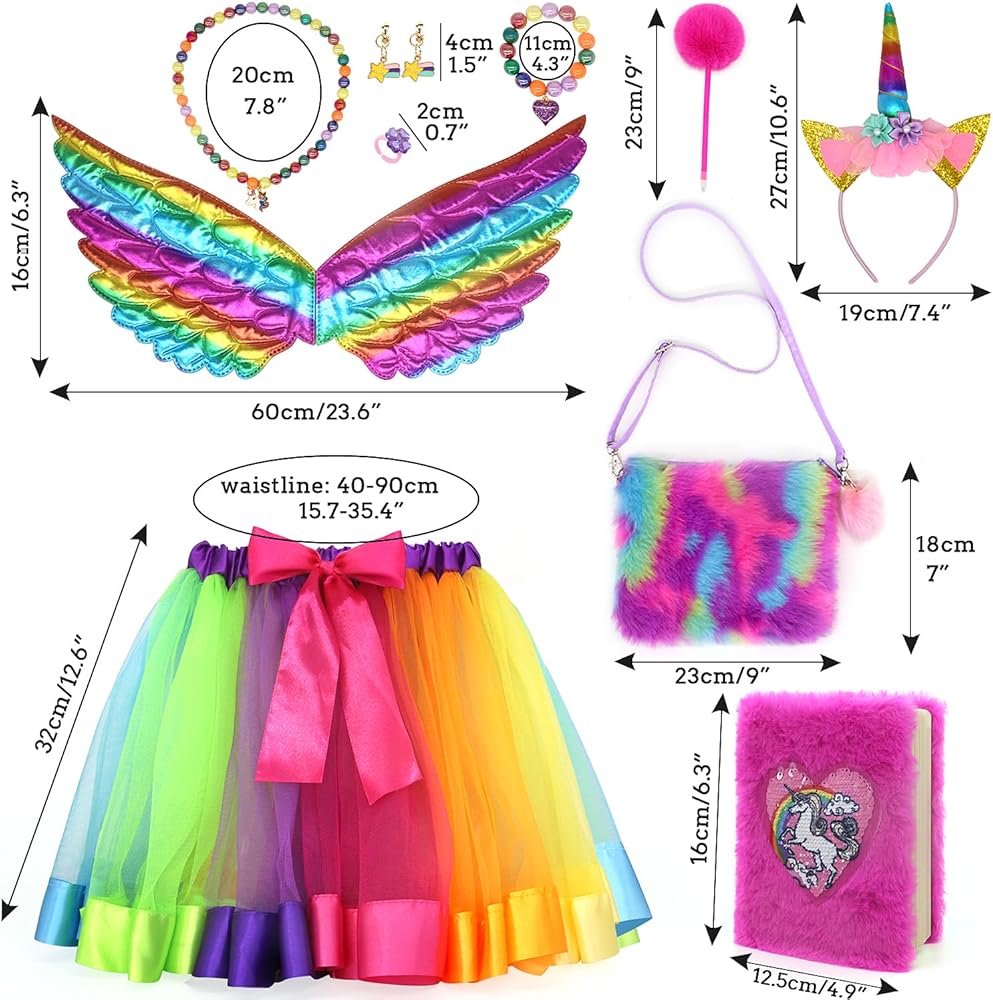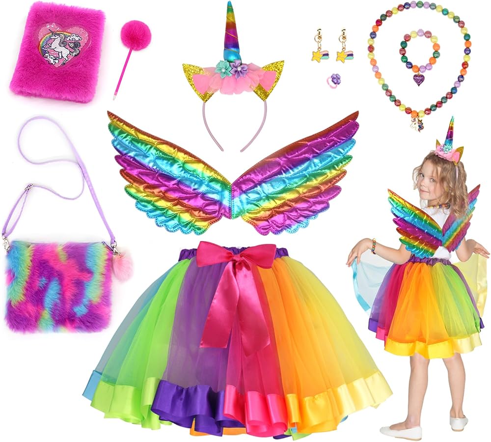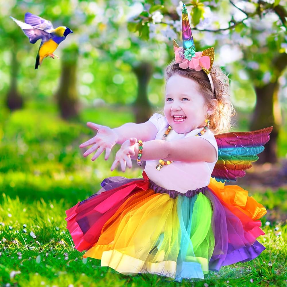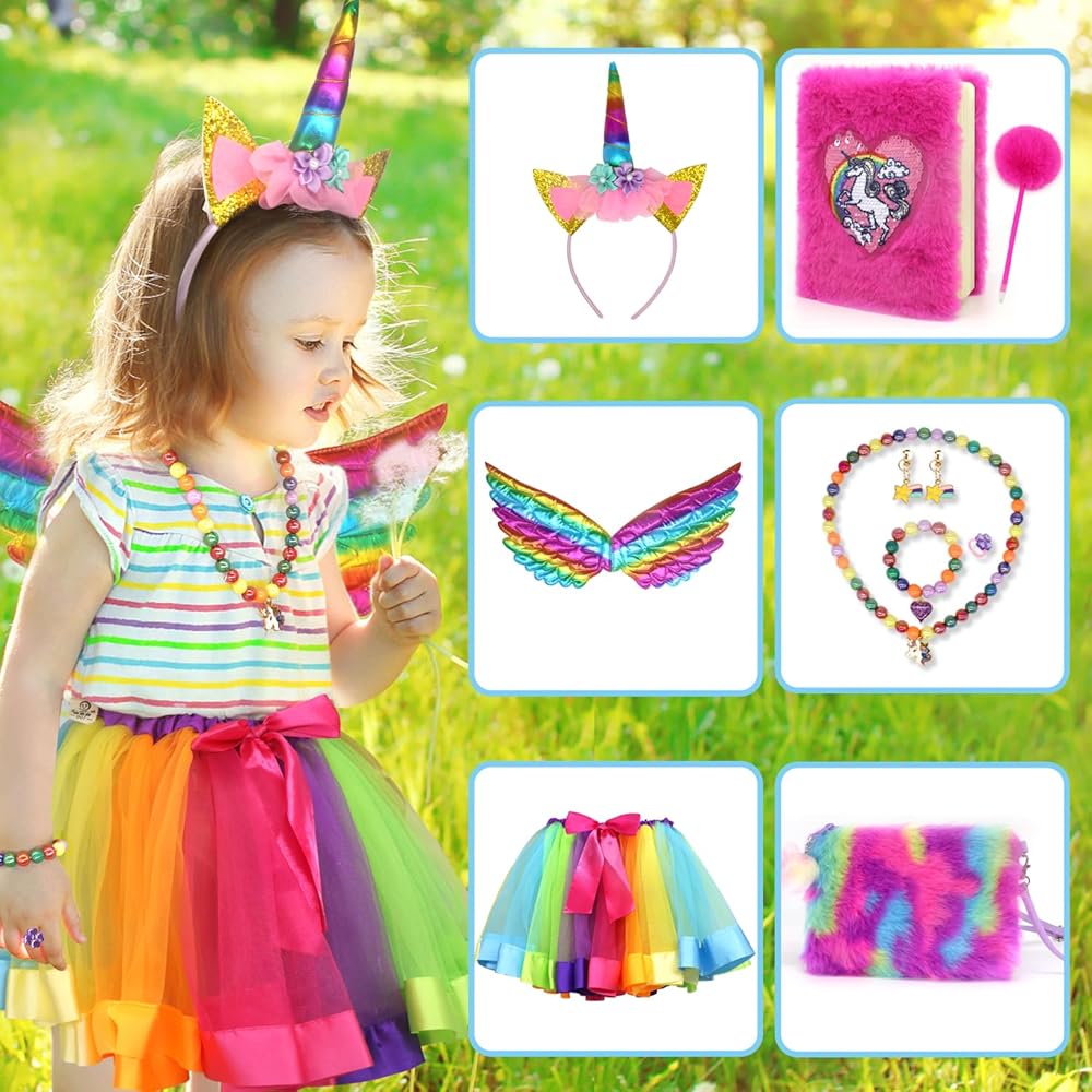 ملابس الأميرة للفتيات الصغيرات هدية وحيد القرن مجموعة أزياء الأميرة الجنية حورية البحر مع فستان توتو، أجنحة الجنية، مجوهرات اللعب، عصابة الرأس، هدية عيد ميلاد للفتيات الصغيرات