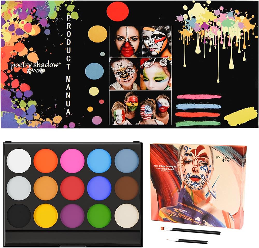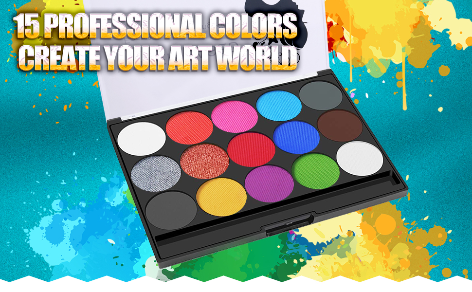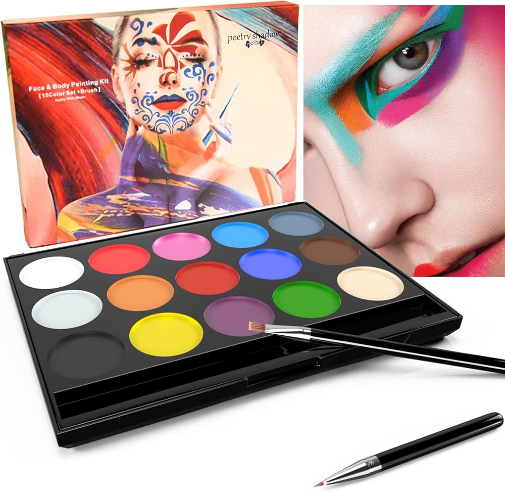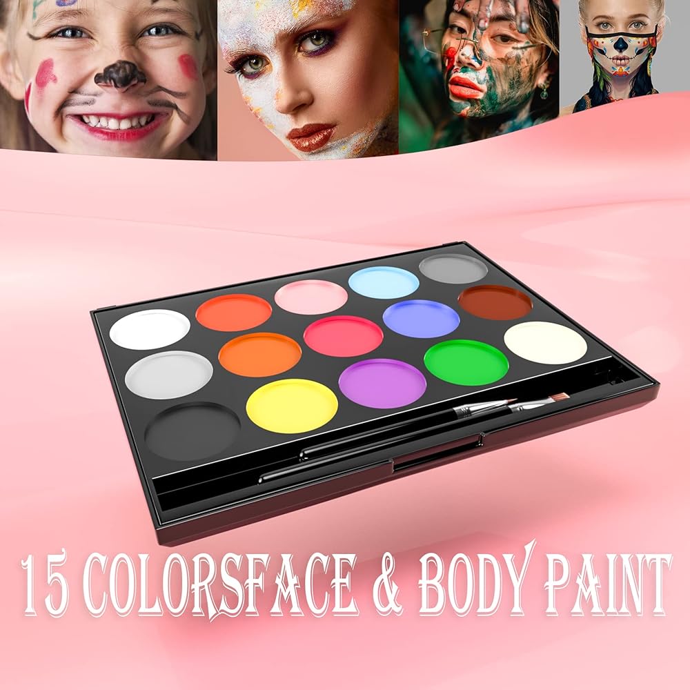 مجموعة طلاء الوجه والجسم، لوحة المكياج التي تعمل بالماء في الهالوين، تخزين مدمج في المساحة مع فرشتين - مجموعة طلاء فنية آمنة احترافية 15 لونًا للحفلات التنكرية والحفلات