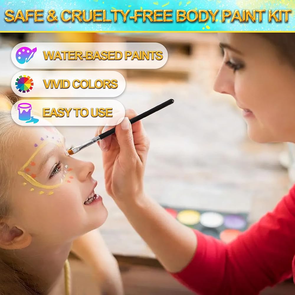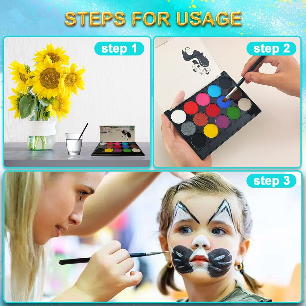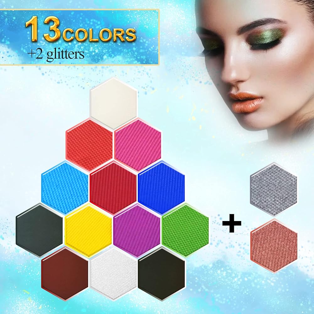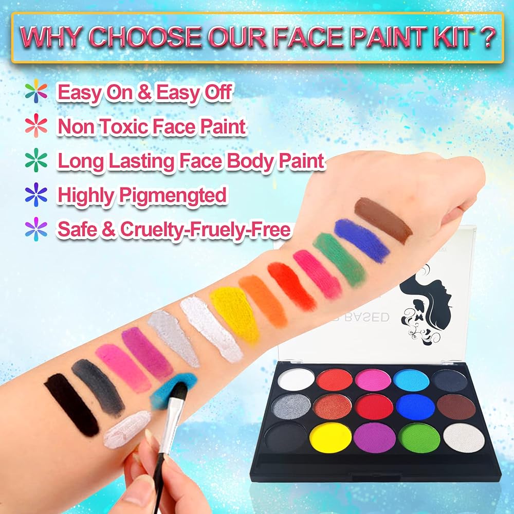 مجموعة طلاء الوجه والجسم، لوحة المكياج التي تعمل بالماء في الهالوين، تخزين مدمج في المساحة مع فرشتين - مجموعة طلاء فنية آمنة احترافية 15 لونًا للحفلات التنكرية والحفلات