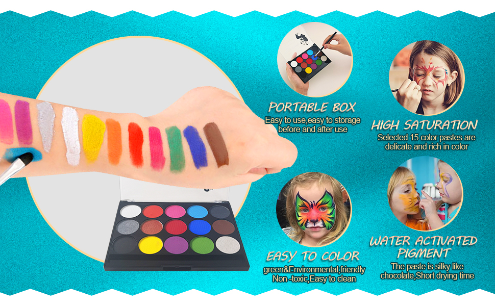 • 【لوحة ألوان آمنة وعالية الجودة】طلاء وجه فاخر قابل للغسل للمحترفين والمبتدئين. تم تركيبه ليكون شبه ناعم ، منشط بالماء ، رطب وغير دهني. مكونات من الدرجة التجميلية لطيفة على البشرة. هذا المنتج ذو أساس مائي وسهل الاستعمال.