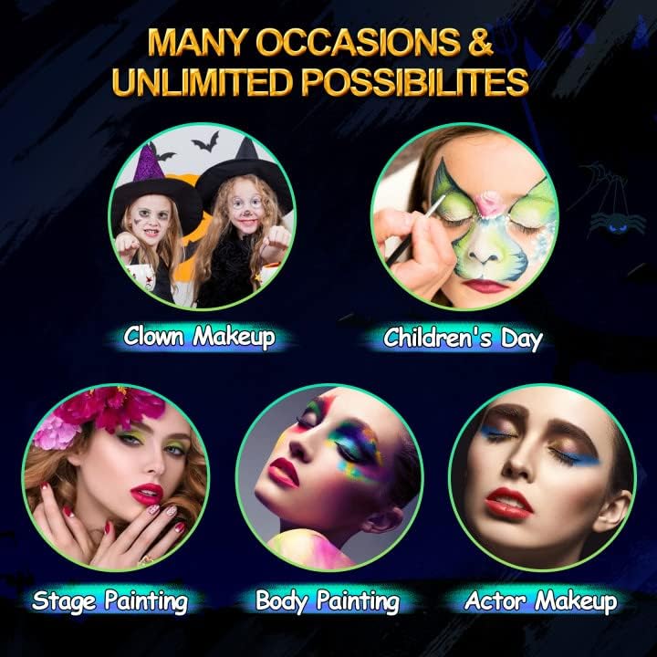 • ابتكر المرح باستخدام مجموعة الطلاء المائي الاحترافية التي تعد مثالية لأي نوع من الكرنفالات والمهرجانات والعروض المسرحية والحفلات مع مجموعة فن الرسم هذه يمكنك اللعب المرح مع تأثيري وماكياج SFX وإطلالات الدم المزيفة. مناسب لنفسك ولأطفالك والمبتدئين ورسامي الوجه المحترفين. إذا تلقيت المنتج المعيب، أو لم تكن راضيًا عن منتجاتنا. لا تتردد في الاتصال وسوف نبذل قصارى جهدنا لحلها لك.