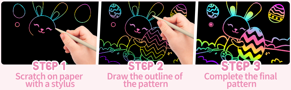 تنظيف آمن وسهل - مجموعة فن الخدش للأطفال مصنوعة من ورق عالي الجودة، بدون رائحة غريبة وليس من السهل كسرها أو تمزيقها. يمكن مسح المسحوق الأسود الموجود على ورق الفن واليدين بسهولة بعد الرسم، ولن يسبب فوضى.
