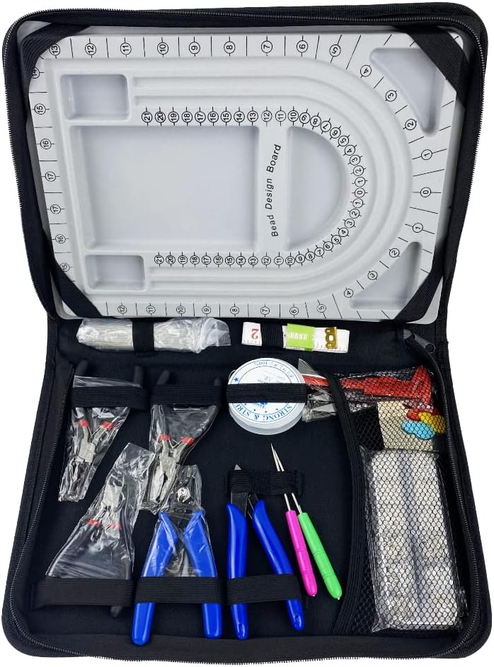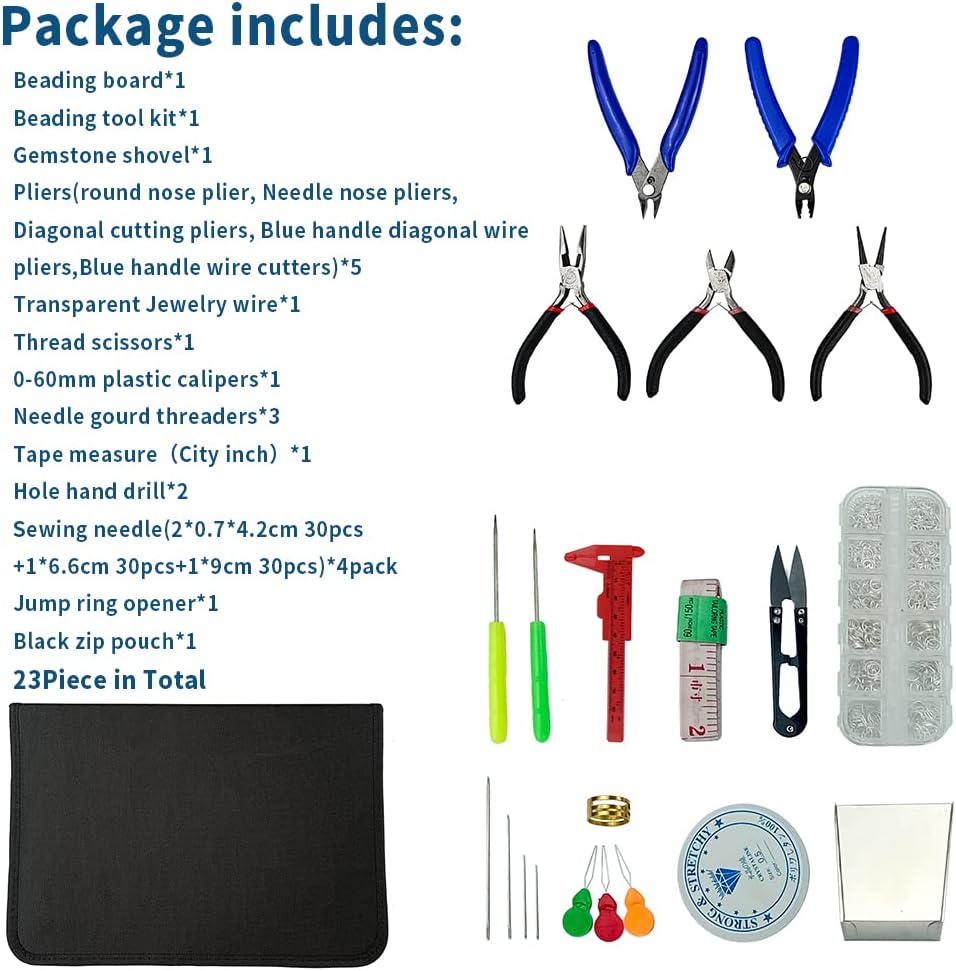 تتضمن كل ما تحتاجه: تتضمن مجموعة موردي صناعة المجوهرات 1 لوح خرز، 1 مجموعة أدوات الخرز، 1 مجرفة الأحجار الكريمة، 5 كماشة (كماشة أنف دائرية، كماشة أنف إبرة، كماشة قطع قطرية، كماشة سلك قطرية بمقبض أزرق، قاطع أسلاك بمقبض أزرق)، 1 سلك مجوهرات شفاف × 1، 1 مقص خيط، 1 فرجار بلاستيكي 0-60 ملم، 3 إبر 1 شريط قياس (انش المدينة)، مثقاب يدوي بفتحتين، 4 إبرة خياطة (2 × 0.7 × 4.2 سم، 30 قطعة + 1 × 6.6 سم، 30 قطعة + 1 × 9 سم 30 قطعة)، 1 فتاحة حلقات مفتوحة، 1 حقيبة سوداء بسحاب، 23 قطعة إجمالاً، تأتي مجموعة صنع المجوهرات مع حقيبة سوداء فاخرة بسحاب وصندوق تخزين بلاستيكي، حتى تتمكن من الاحتفاظ بها الأدوات والنتائج سهل الاستخدام ومنظم وآمن، ولا داعي للقلق بشأن فقدان الأدوات أو الملحقات.