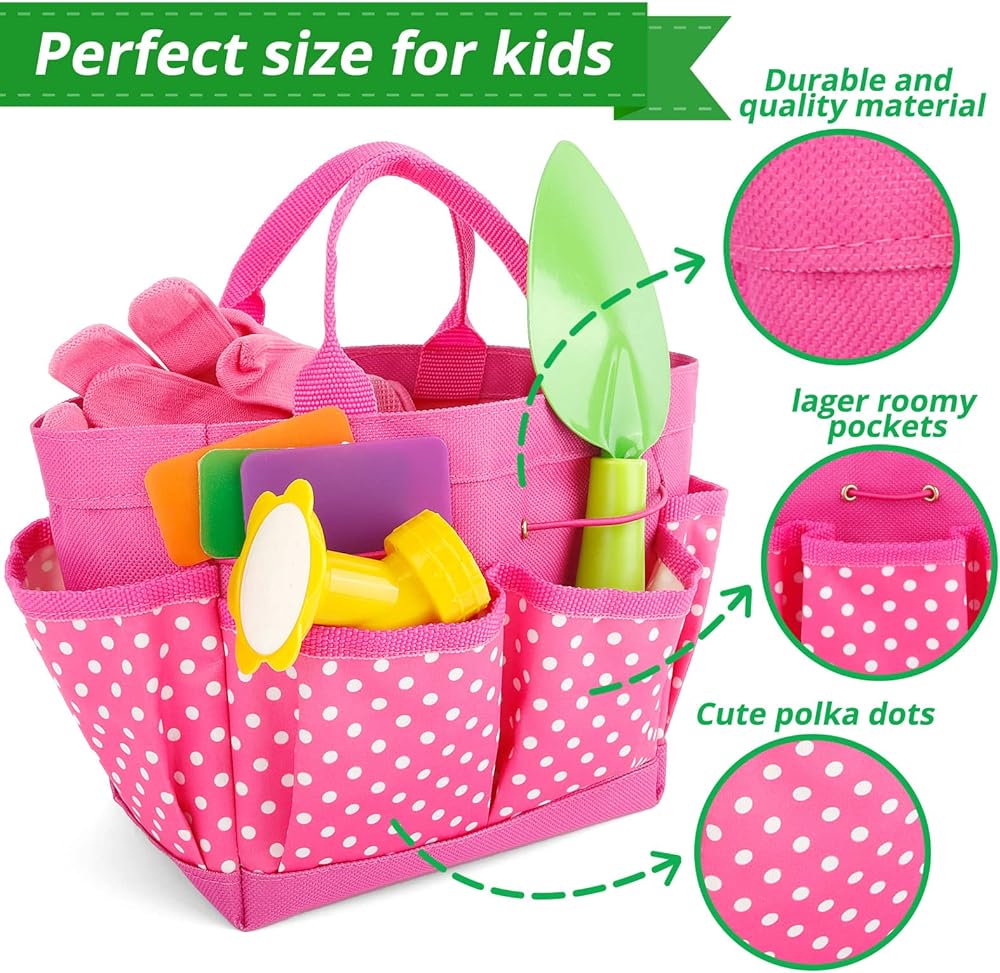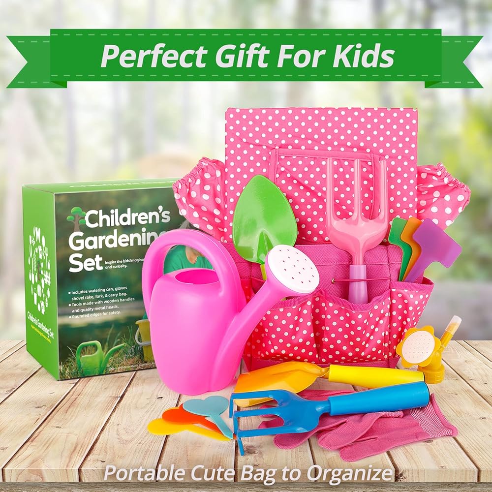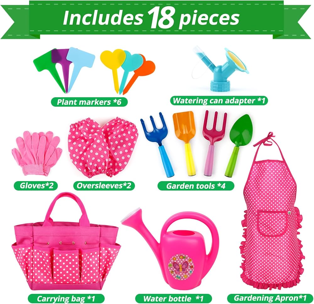 مجموعة أدوات البستنة للأطفال من Veitch fairytales، هدايا عيد ميلاد للأطفال الصغار بعمر 3 سنوات فما فوق، مجموعة أدوات حديقة للفتيات الصغيرات 17 قطعة بما في ذلك قفازات المئزر، علبة سقي، مجرفة، مجرفة وحقيبة حمل (نقطة موجة)