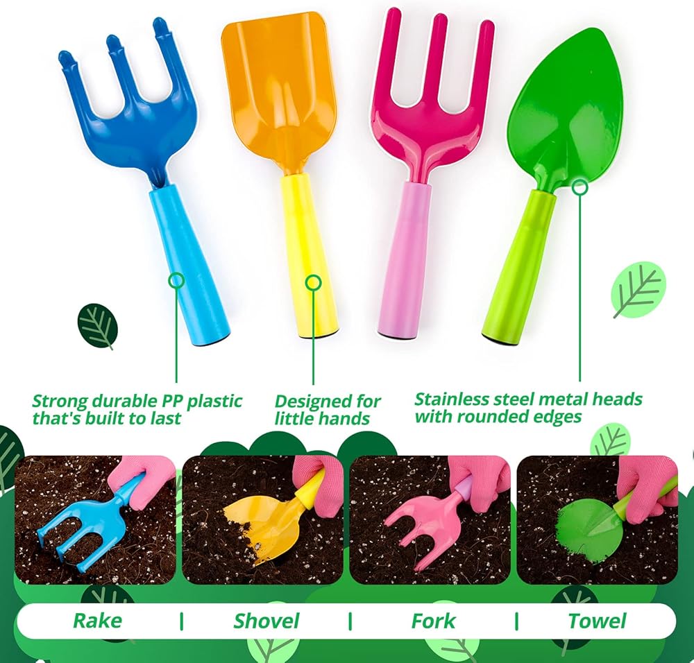 🪴【 هدية رائعة 】- إنها هدية مثالية للعطلات. أدوات البستنة تلهم الأطفال على حب الطبيعة وتزيد من الوعي البيئي لديهم. الأداة خفيفة ومتينة ومصممة للأيدي الصغيرة. مثالية لألعاب اللعب في الحديقة والشاطئ في الهواء الطلق. يوصى به كهدية عيد ميلاد أو عطلة للأطفال فوق سن 3 سنوات.
