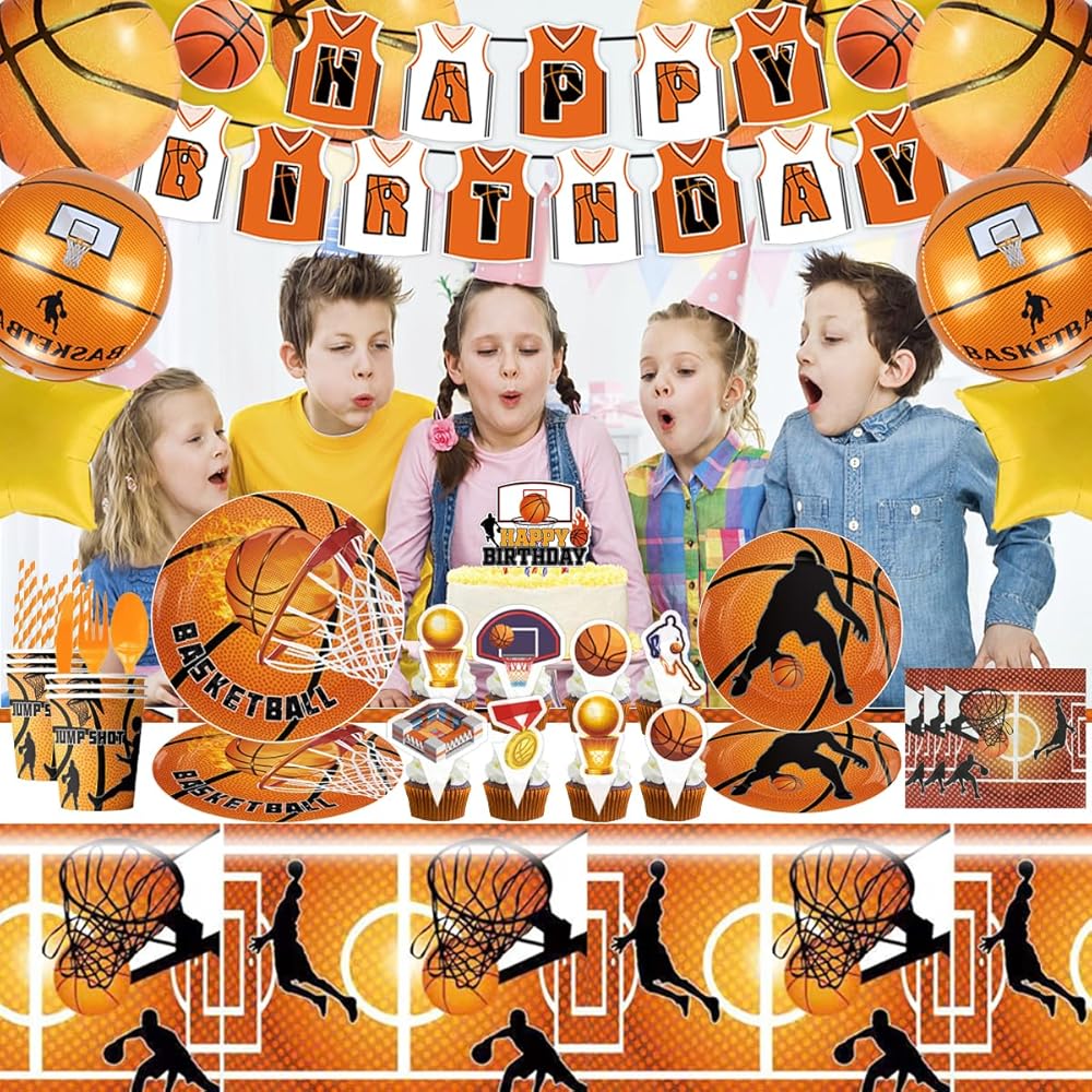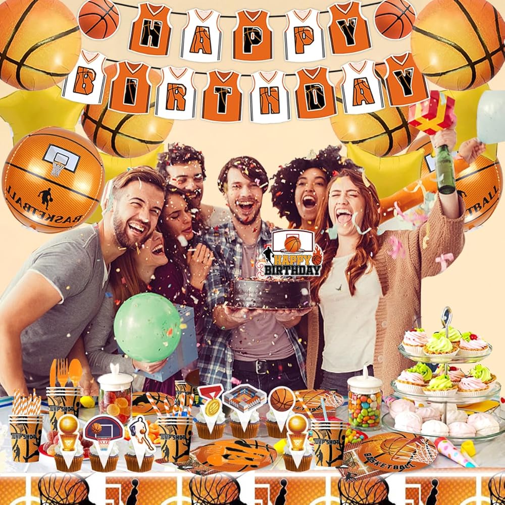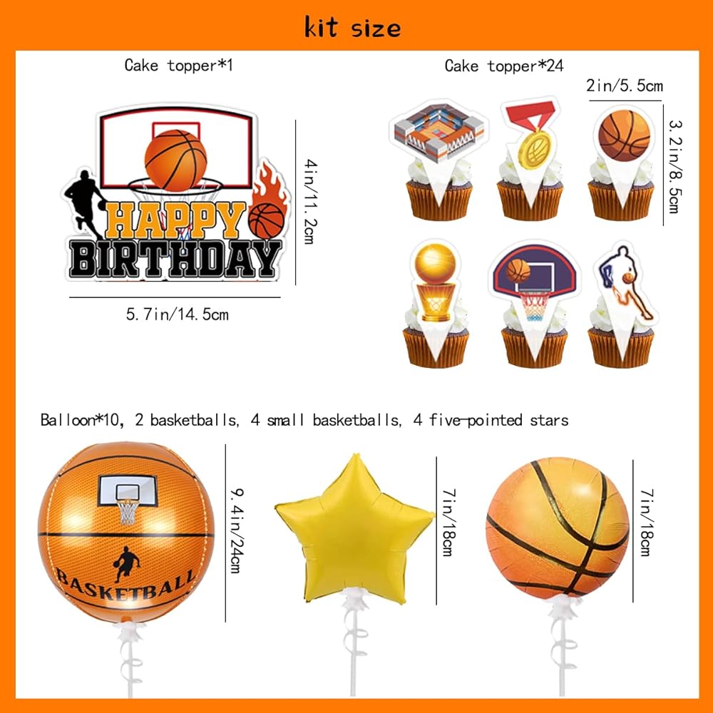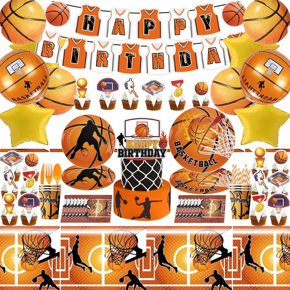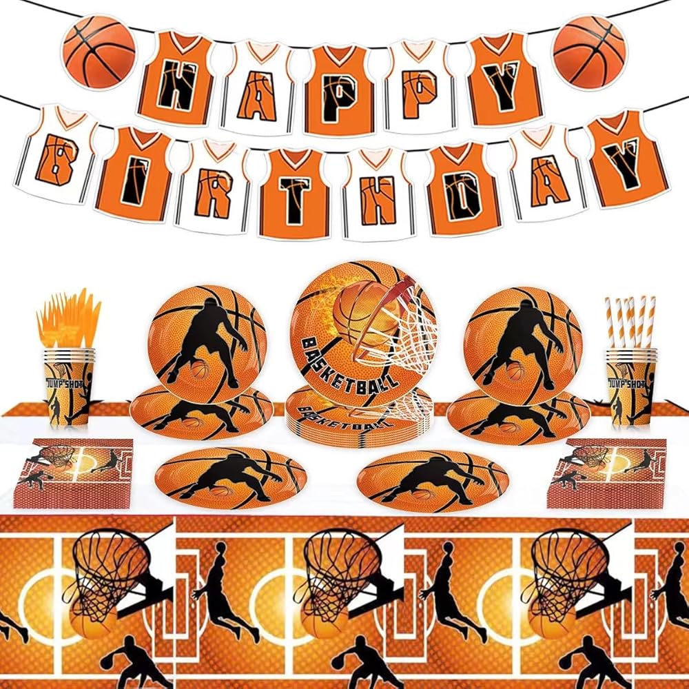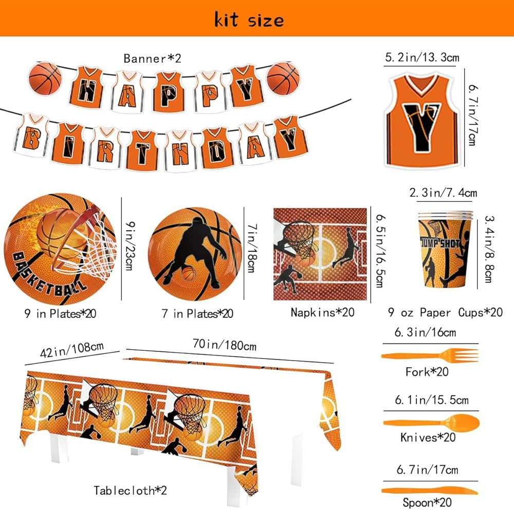 مجموعة لوازم حفلات كرة السلة تتضمن لافتة وبالون وزينة كب كيك واطباق ومنديل وكوب وشوكة وسكاكين وملعقة وقشة ومفرش طاولة لتزيين حفلات اعياد الميلاد بطابع كرة السلة، تكفي 20 قطعة