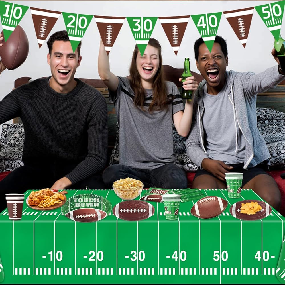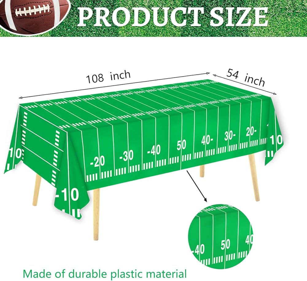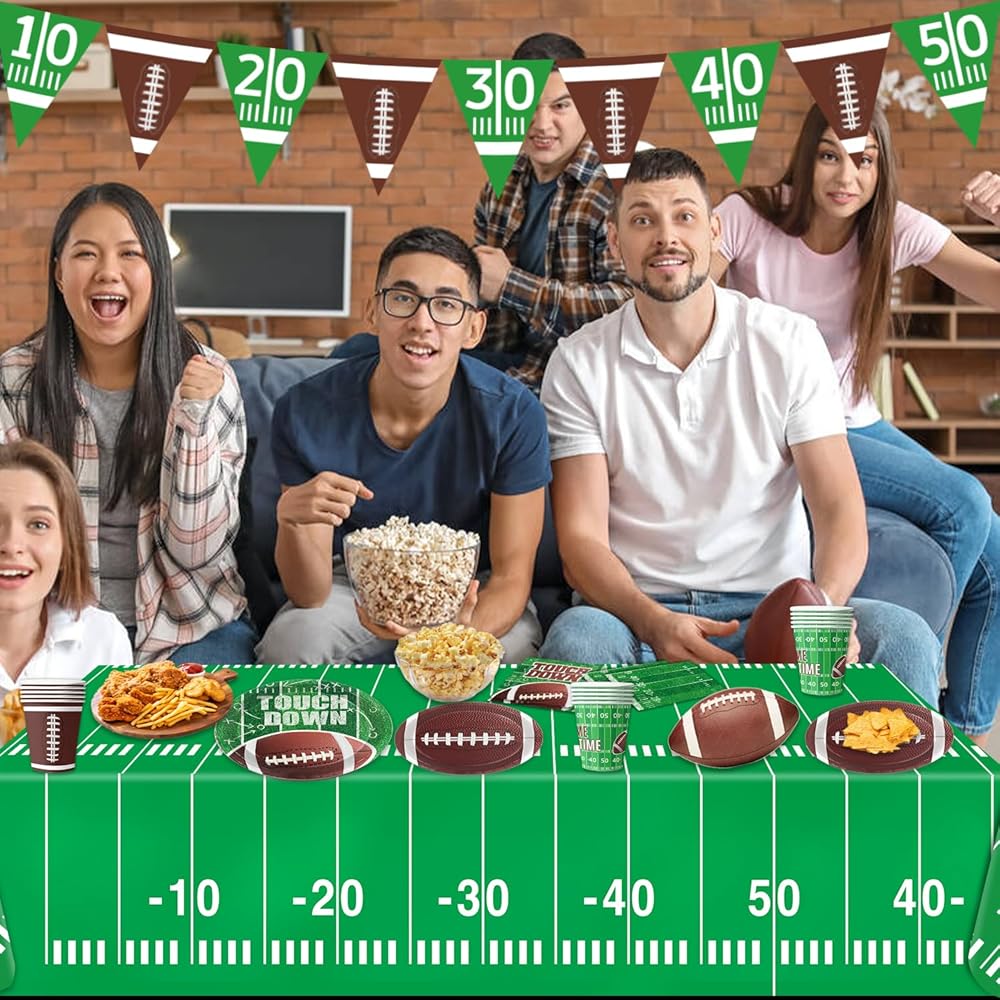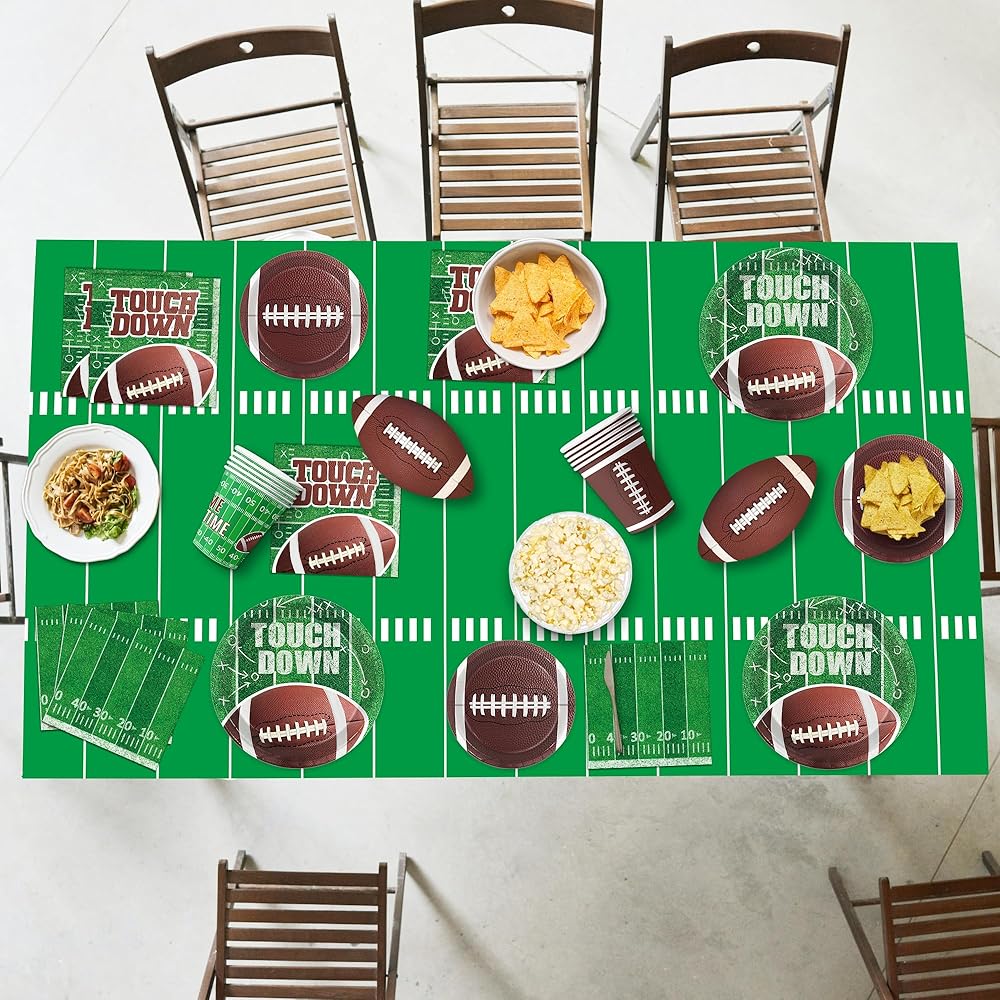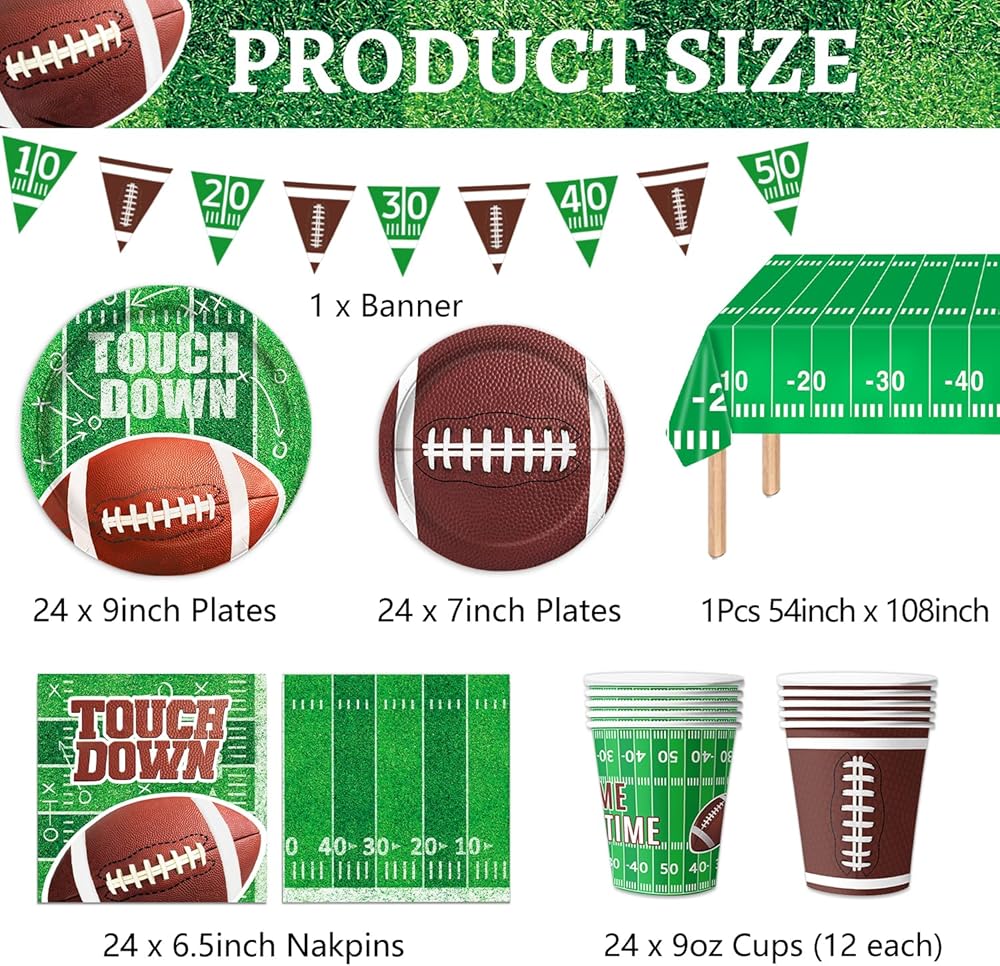 • 【Football Party Decorations】: Get ready to score big with our football themed birthday party supplies set! This all-inclusive package includes a paper banner set (combining yard numbers of the field and football patterns), 24 x 9-inch football plates, 24 x 7-inch football plates, 24 football napkins, and 24 x 9oz football cups, each available in two different styles of 12 each. Plus, we've got you covered with a 54" x 108" football tablecloth to complete the look.