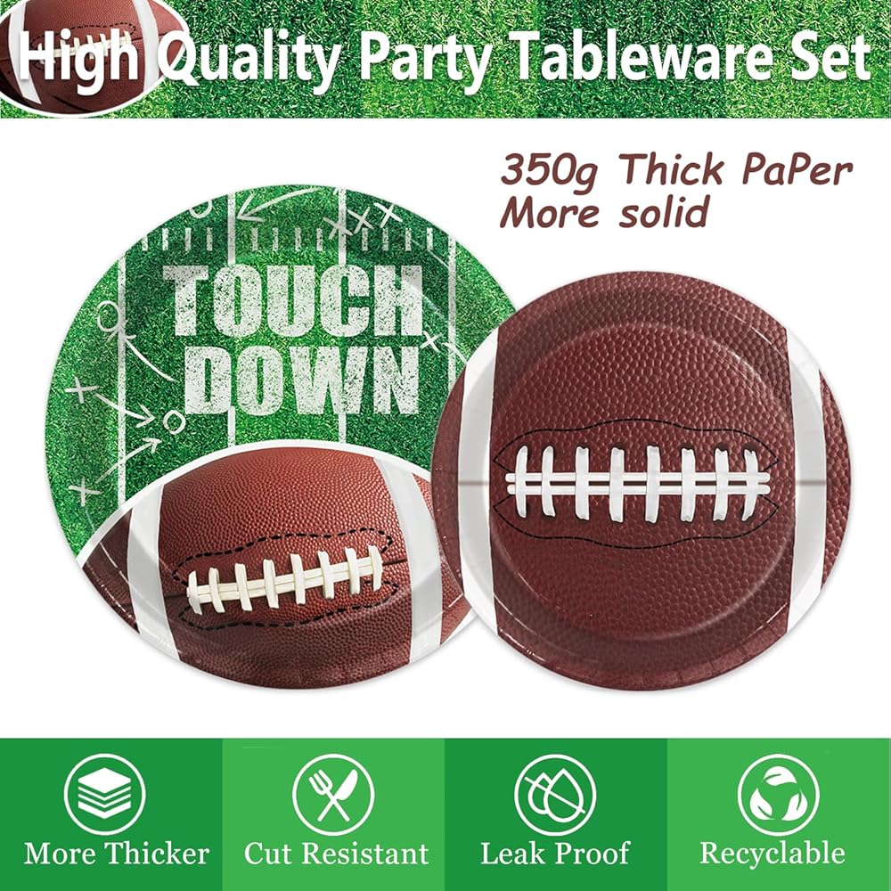 • 【Football Themed Design】: These football party supplies are desig ned with football elements such as the football, field, authentic green turf, midfield line, touchlines, in-goal area, scoring zone, try lines, and 'TOUCH DOWN' words on our football party plates and napkins, adding a thrilling atmosphere to your party decor. Decorating your party with American football party decorations will be a fantastic choice.