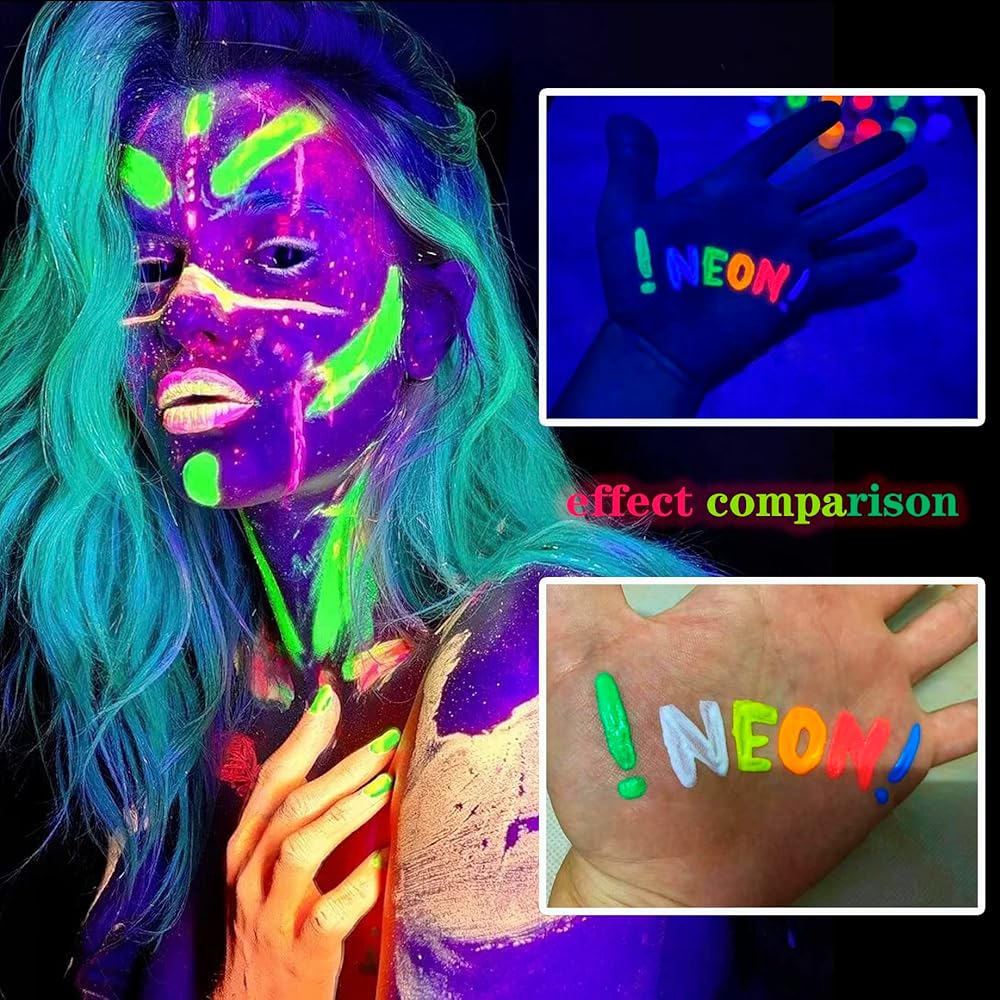 مجموعة ألوان الشمع الليلية: سوف تحصل على مجموعة مزدوجة من 6 أقلام تلوين للوجه بألوان مختلفة، والتي لا تلبي احتياجات المكياج الخاصة بك فحسب، بل تنبعث أيضًا ضوءًا قويًا تحت تأثير أضواء النيون هذه.