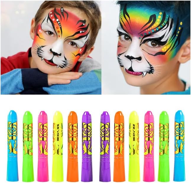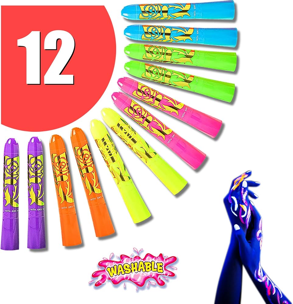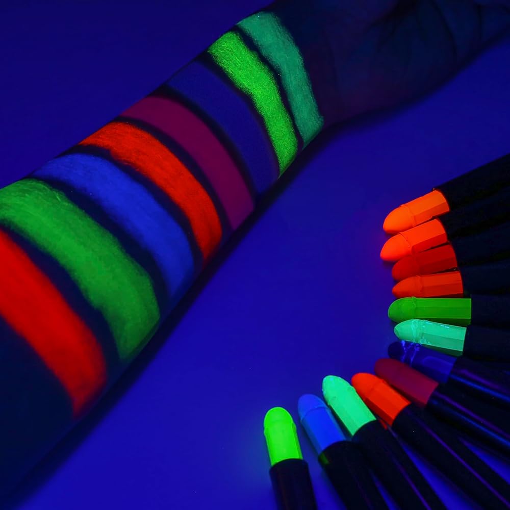 12 قطعة من أقلام تلوين الوجه والجسم المتوهجة باللون الأسود والأشعة فوق البنفسجية نيون توهج فلورسنت لمكياج نادي الهالوين وعيد الميلاد المتوهج للحفلات الملونة للنساء والفتيات