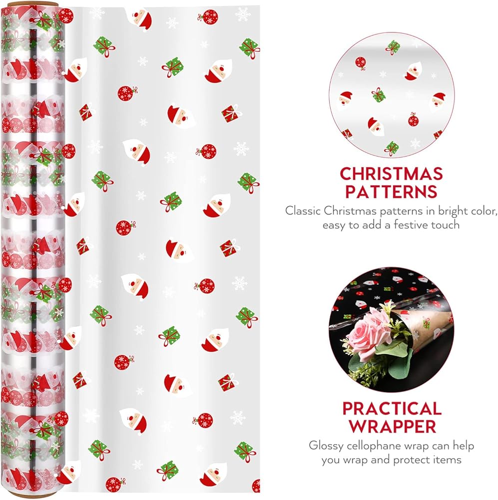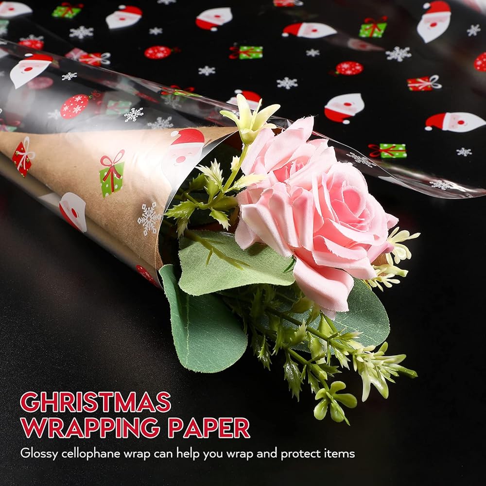 - غطاء السيلوفان الخاص بنا مع أنماط عيد الميلاد، يبلغ مقاسه 40 × 3000 سم، ويمكن استخدامه للتغليف وحماية العديد من العناصر، مثل الزهور وأكياس الهدايا والسلال، إلخ.