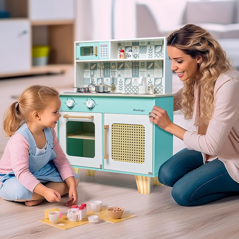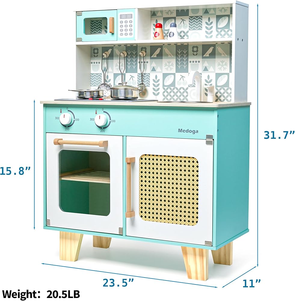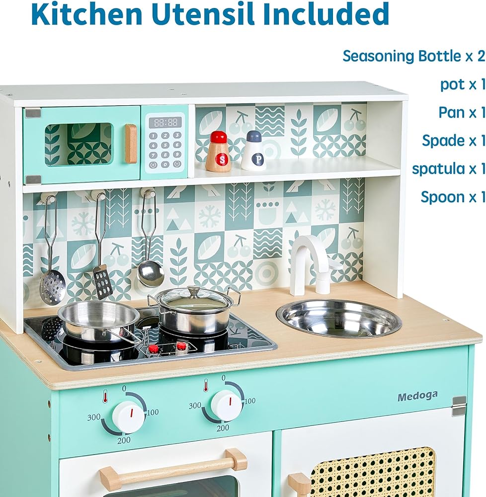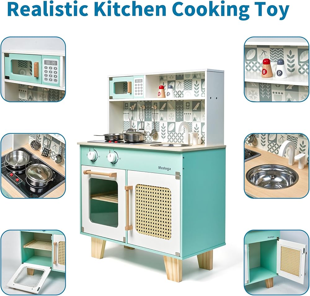 مجموعة ألعاب مطبخ خشبية، مجموعة مطبخ للأطفال الصغار للأعمار من 3 إلى 6 سنوات، مطبخ لعب تظاهري مع أضواء وأصوات حقيقية، مجموعات ألعاب مطبخ للأطفال مع 8 قطع من ملحقات أواني الطبخ، لعبة هدية للفتيات والفتيان (أخضر)