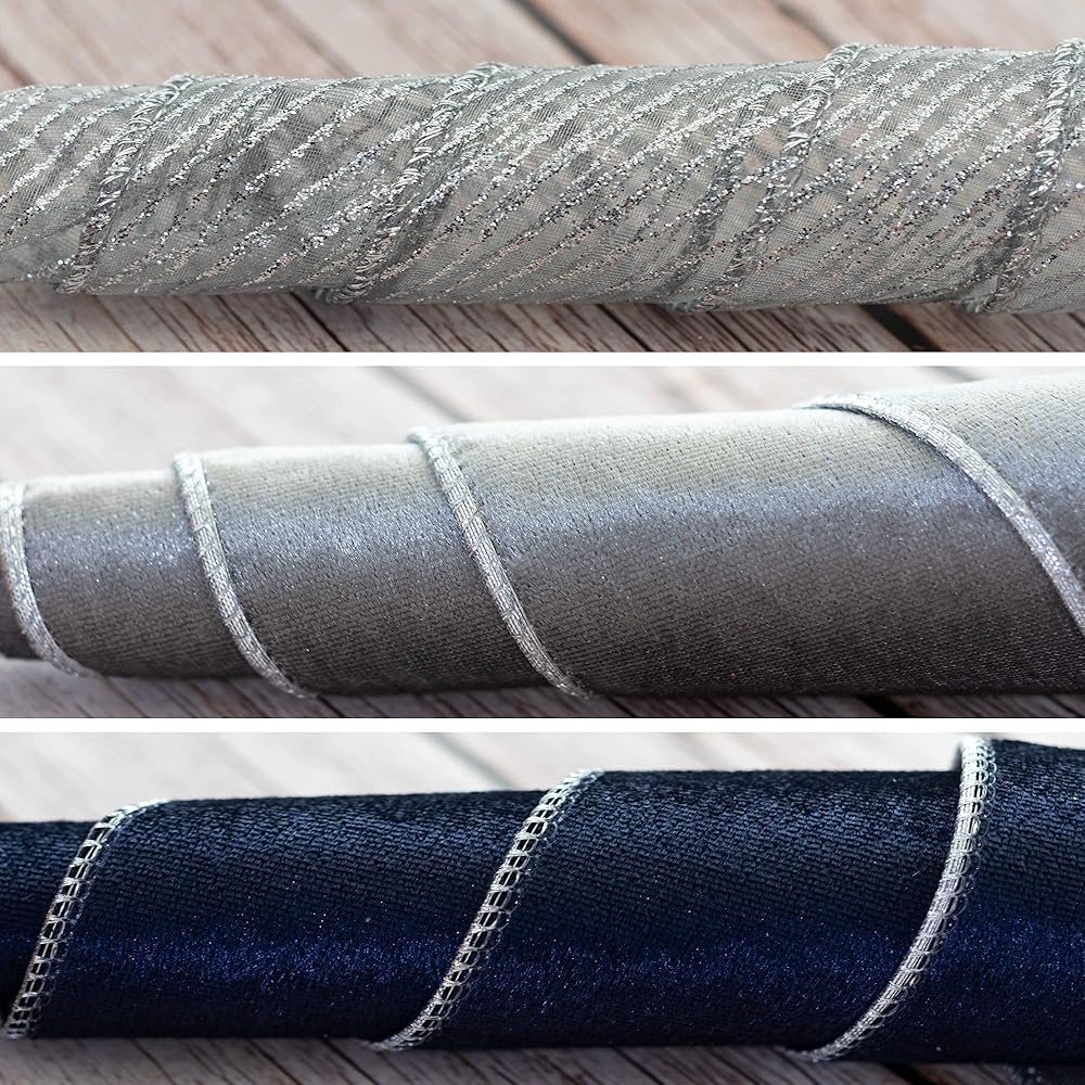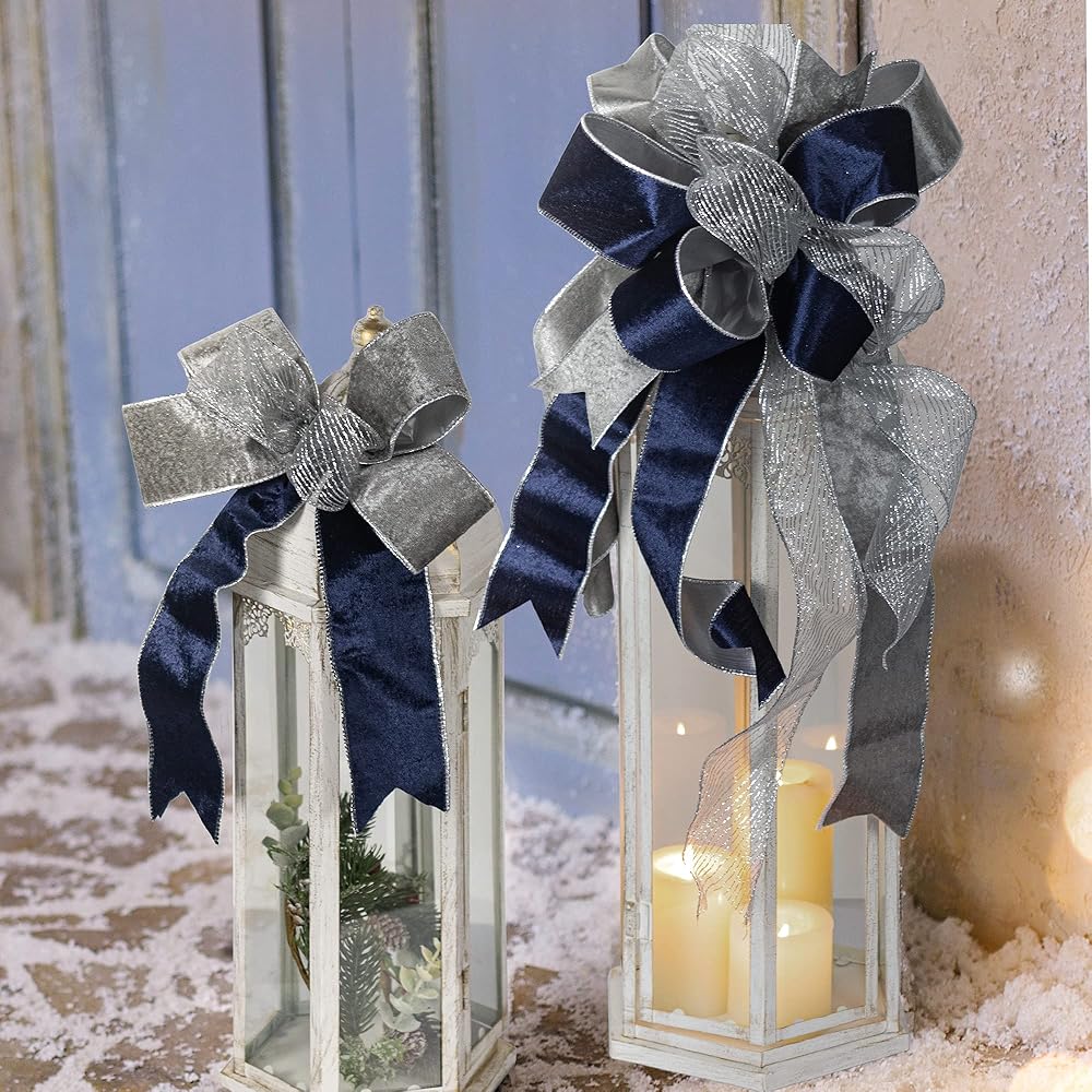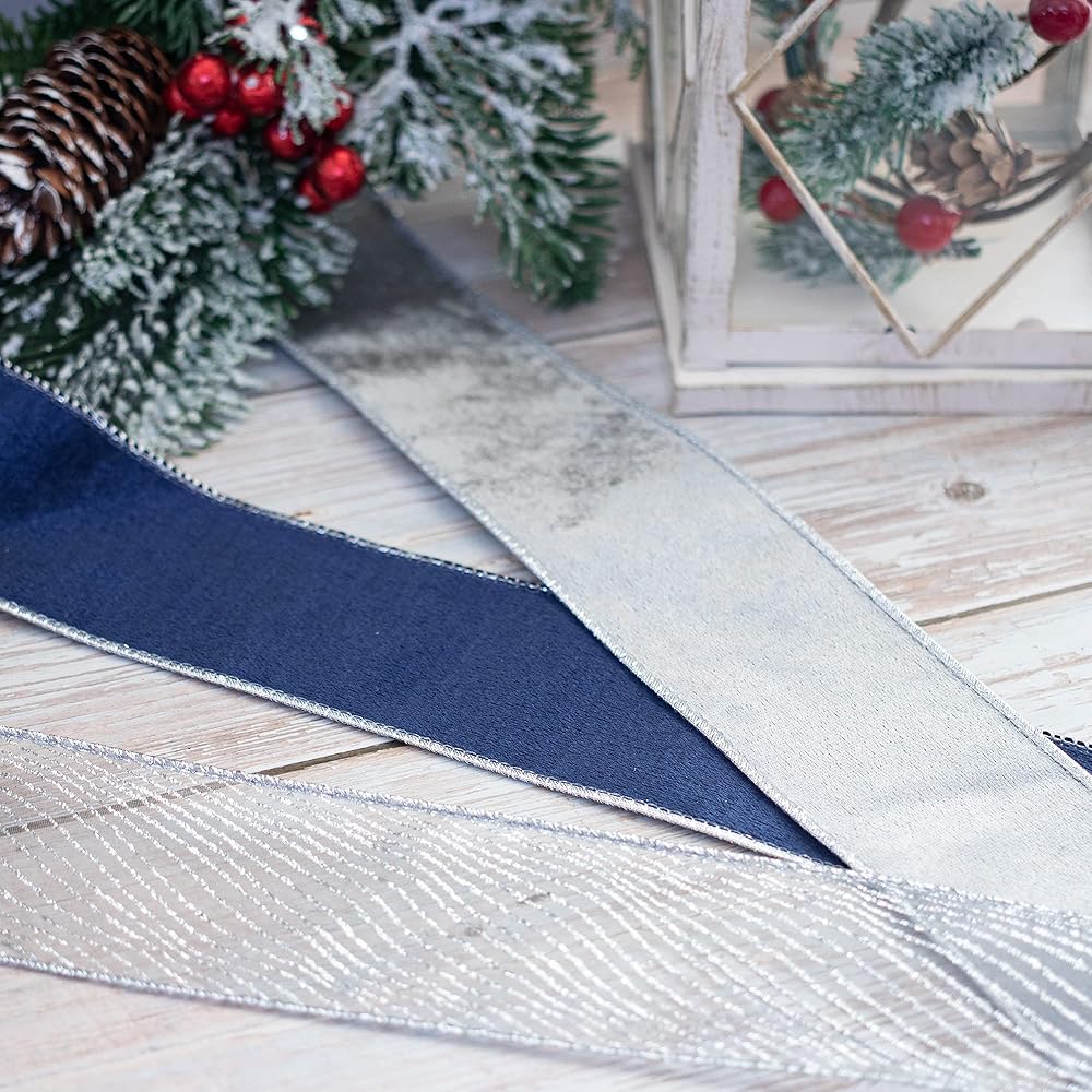 شريط مخملي سلكي من KI Store، شريط أزرق وفضي لتزيين شجرة عيد الميلاد، مجموعة مكونة من 3 قطع مع دعم حريري وشريط مزدوج الجوانب وشريط شفاف لامع مقاس 2.5 بوصة × 10 ياردات لكل بكرة