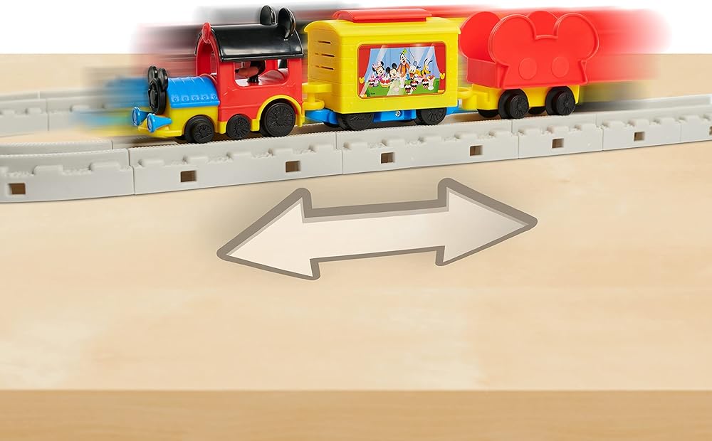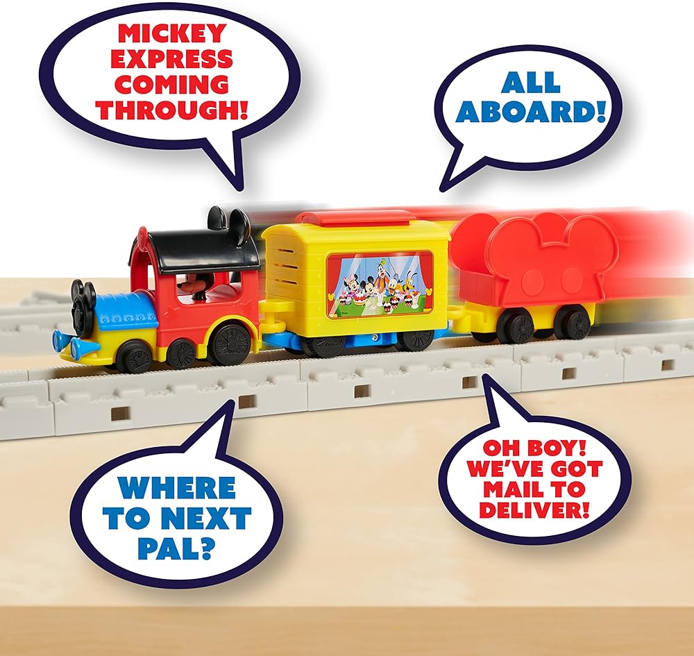 الأصوات والعبارات: استمع إلى أصوات قطار واقعية وأكثر من 20 عبارة ميكي ماوس بينما يتوقف القطار ويتحرك على طول المسار.