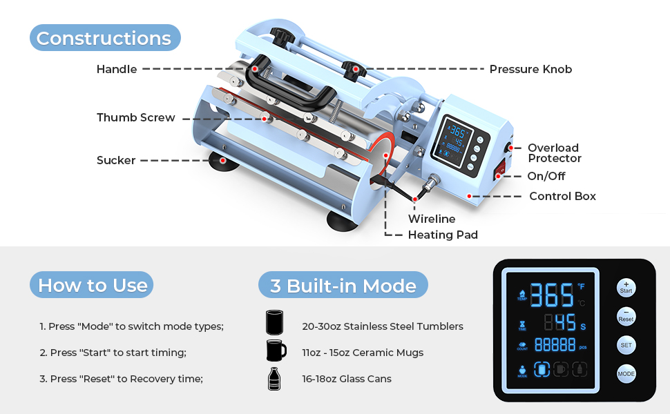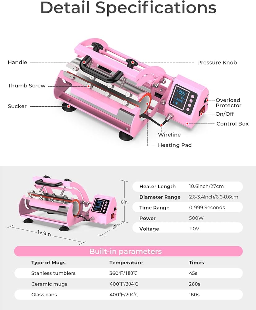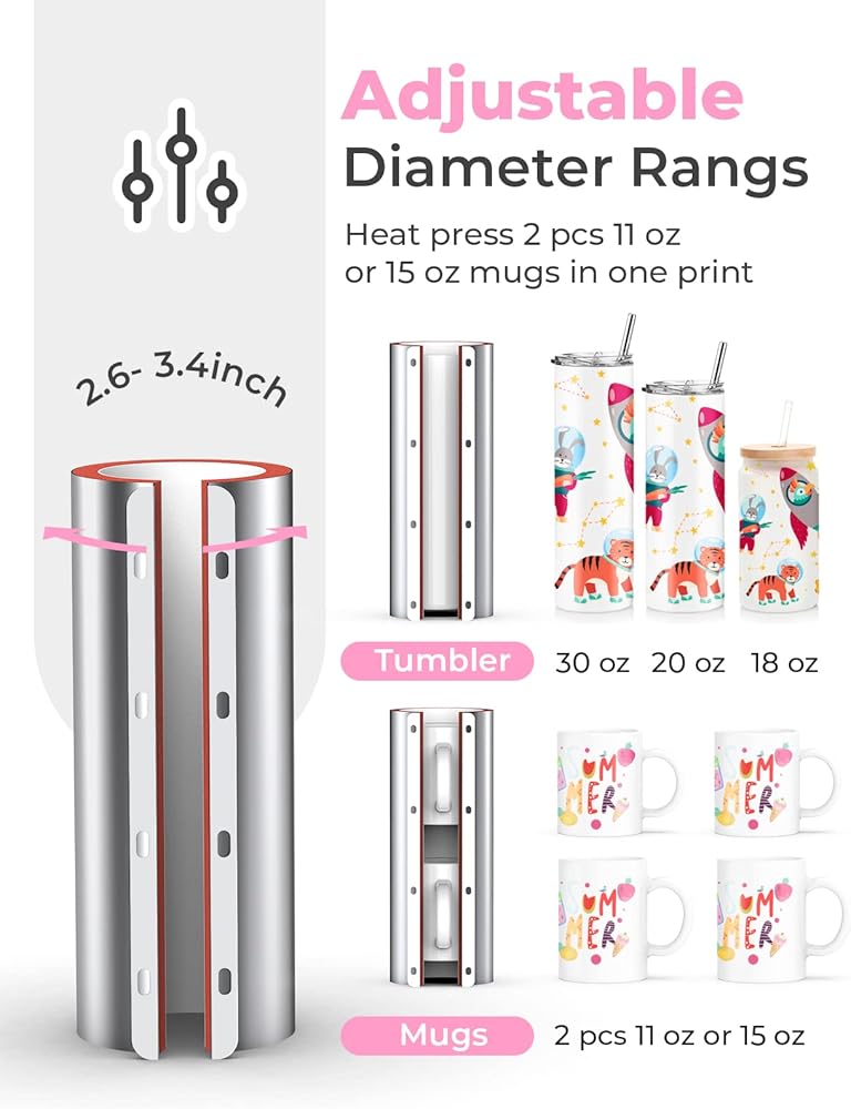♪ آلة ضغط الأكواب 20 و30 أونصة: طول السخان: 10.6 بوصة/27 سم، نطاق القطر 2.6-3.4 بوصة/6.6-8.6 سم. ملحوظة: لا يمكن لمرفق الضغط الحراري للكوب أن يغطي الكوب سعة 30 أونصة بالكامل إذا حدث ذلك فلن يكون هناك ضغط للنقل. إذا كان تصميم الطباعة الخاص بك مخصصًا للطباعة بالعرض الكامل، فنقترح عليك تدوير الأكواب والطباعة مرتين.