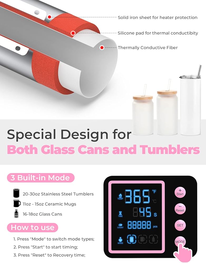 ♪ وظيفة مثالية 2 N 1: أداء رائع لعنصر التسخين يضمن الحصول على نتائج التسامي من الزجاج والفولاذ المقاوم للصدأ. بالنسبة لتسامي الأكواب الزجاجية، درجة الحرارة والوقت الموصى بهما هما 360 فهرنهايت و120 درجة مئوية. بالنسبة لتسامي أكواب الأكواب المصنوعة من الفولاذ المقاوم للصدأ، درجة الحرارة والوقت الموصى بهما هي 360 درجة فهرنهايت و45 درجة مئوية. بالنسبة للأكواب الخزفية، 365 درجة فهرنهايت و200 درجة مئوية.
