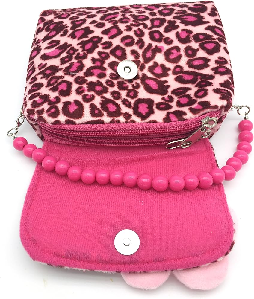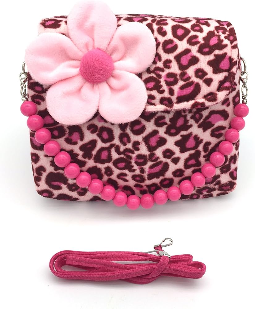 (الفهد الوردي) - مجموعة حقيبة يد للفتيات الصغيرة من Elesa Miracle حقيبة يد من القطيفة للأطفال + حلقات على شكل زهرة بمشبك على شكل زهرة ومشابك للشعر وربطات الشعر + مجموعة قلادة وسوار (فهد وردي)