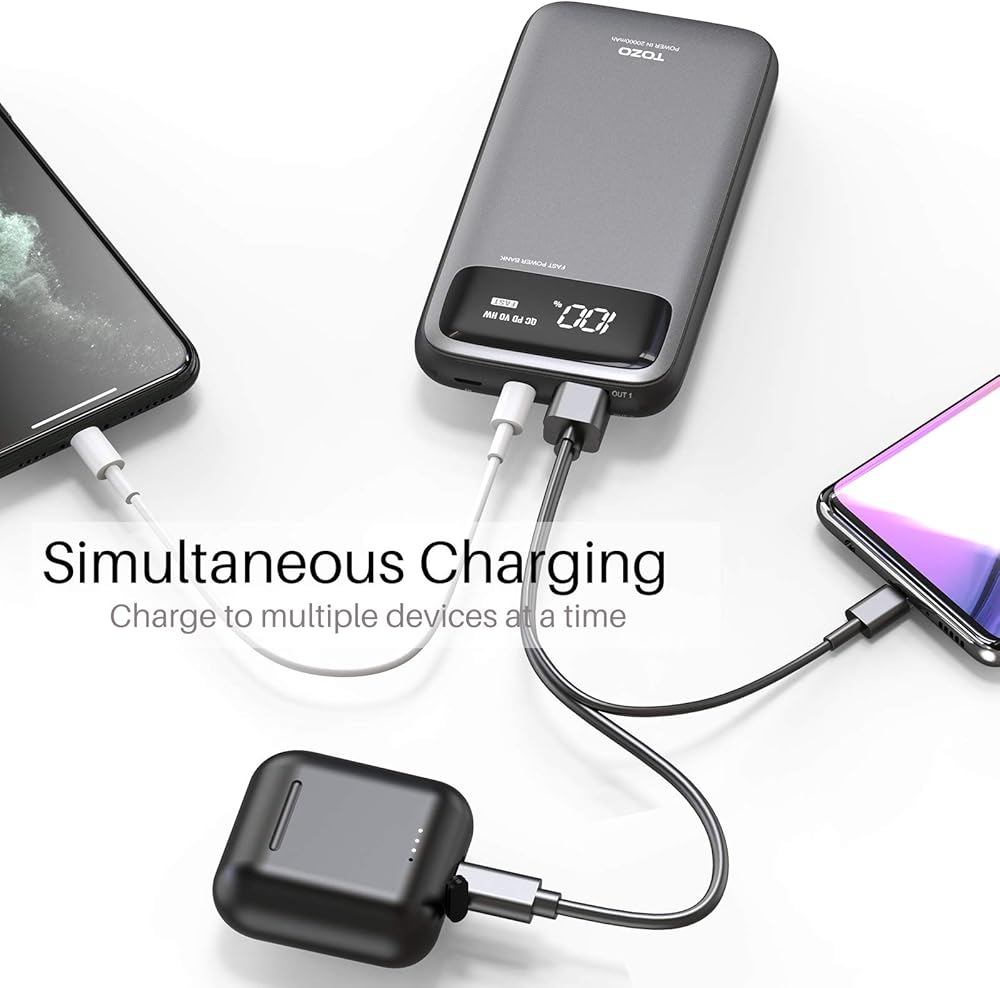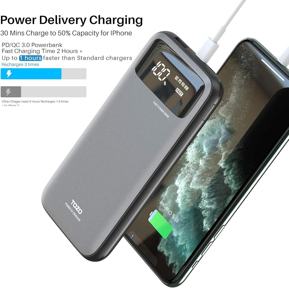 بنك الطاقة TOZO PB2 PD للشحن السريع بقدرة 20000 مللي أمبير في الساعة مع شاشة رقمية مرئية، شاحن محمول بقوة 18 وات مع منافذ إدخال مزدوجة، وسرعة شحن عالية لأجهزة iPhone وSamsung والمزيد. رمادي
