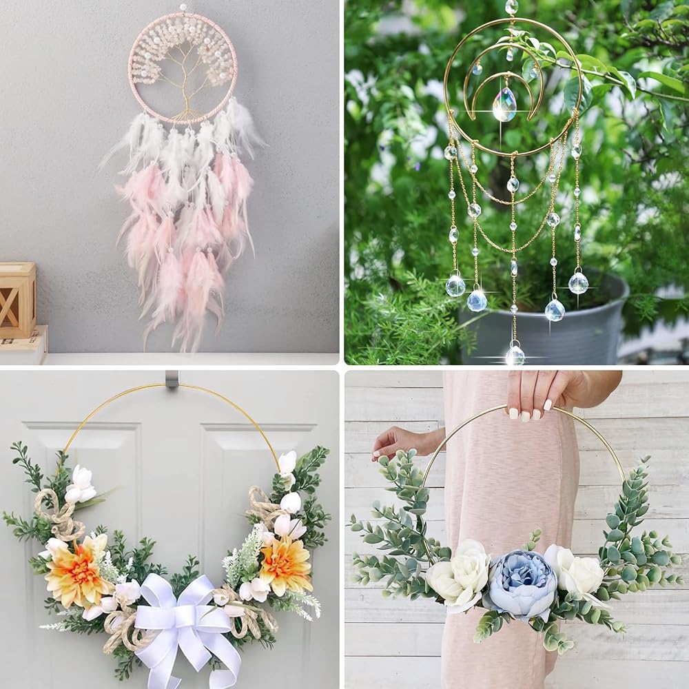 【استخدامات متعددة】مع حلقات إكليل المكرمية الذهبية لا يمكنك فقط صنع إكليل الزهور وصائد الأحلام وحرف المكرمية وشماعات النباتات وغيرها من الحرف اليدوية، ولكن أيضًا صنع إكليل باب الكريسماس وتزيين إكليل الزفاف والحرف اليدوية المعلقة على الحائط.