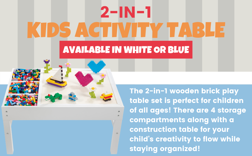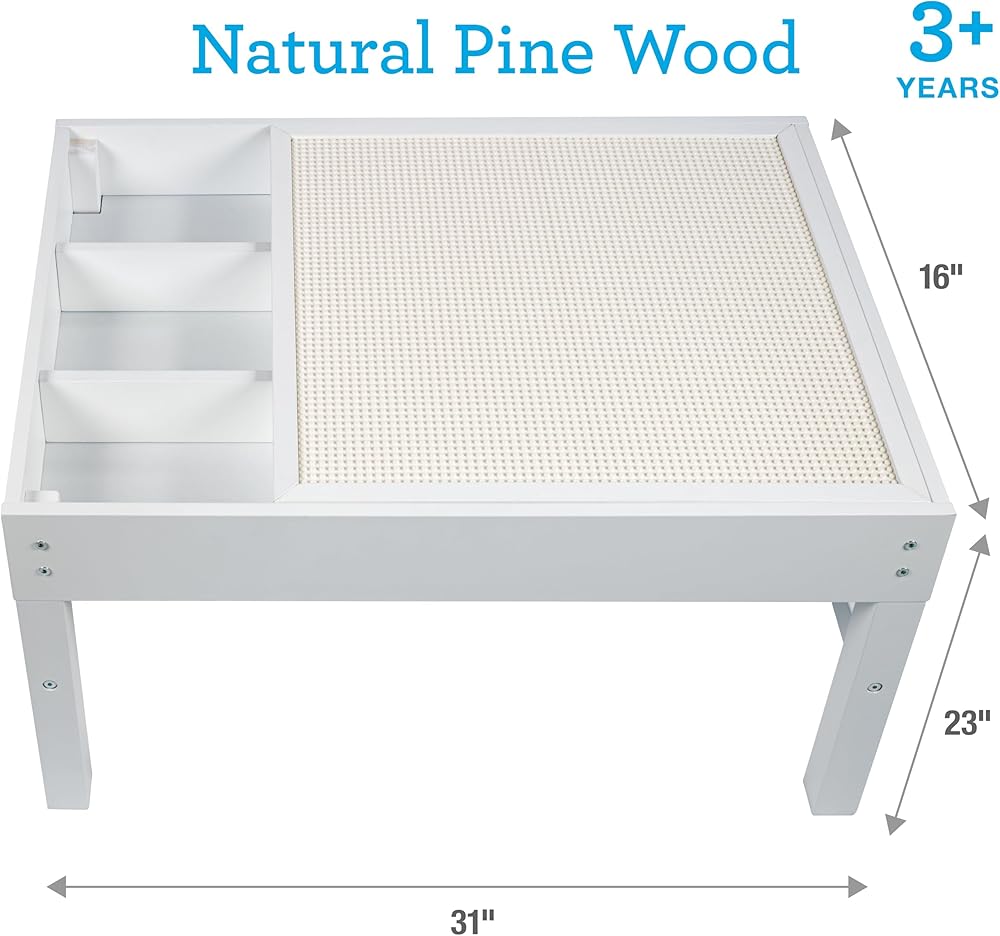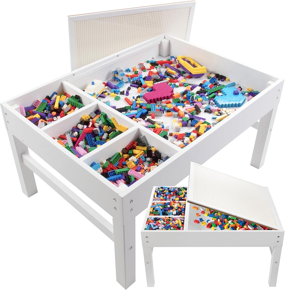 طاولة لعب خشبية على شكل مكعبات مع 4 مساحات تخزين - 3 فواصل خارجية لحمل الألعاب وقطع الطوب وأكثر من ذلك، بالإضافة إلى مساحة تخزين أكبر أسفل لوحة القاعدة