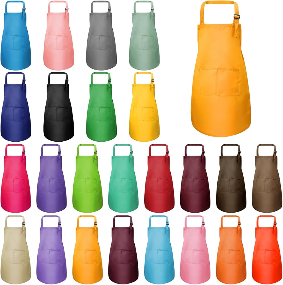24 مريلة للأطفال: تأتي مع 24 قطعة من مآزر الطهاة للأطفال بألوان مختلفة، كافية لتلبية احتياجات طفلك المختلفة، تم تصميم هذه المريلة بجيبين للأطفال لوضع الألعاب والحلوى والفرش وغيرها من الأشياء فيها.